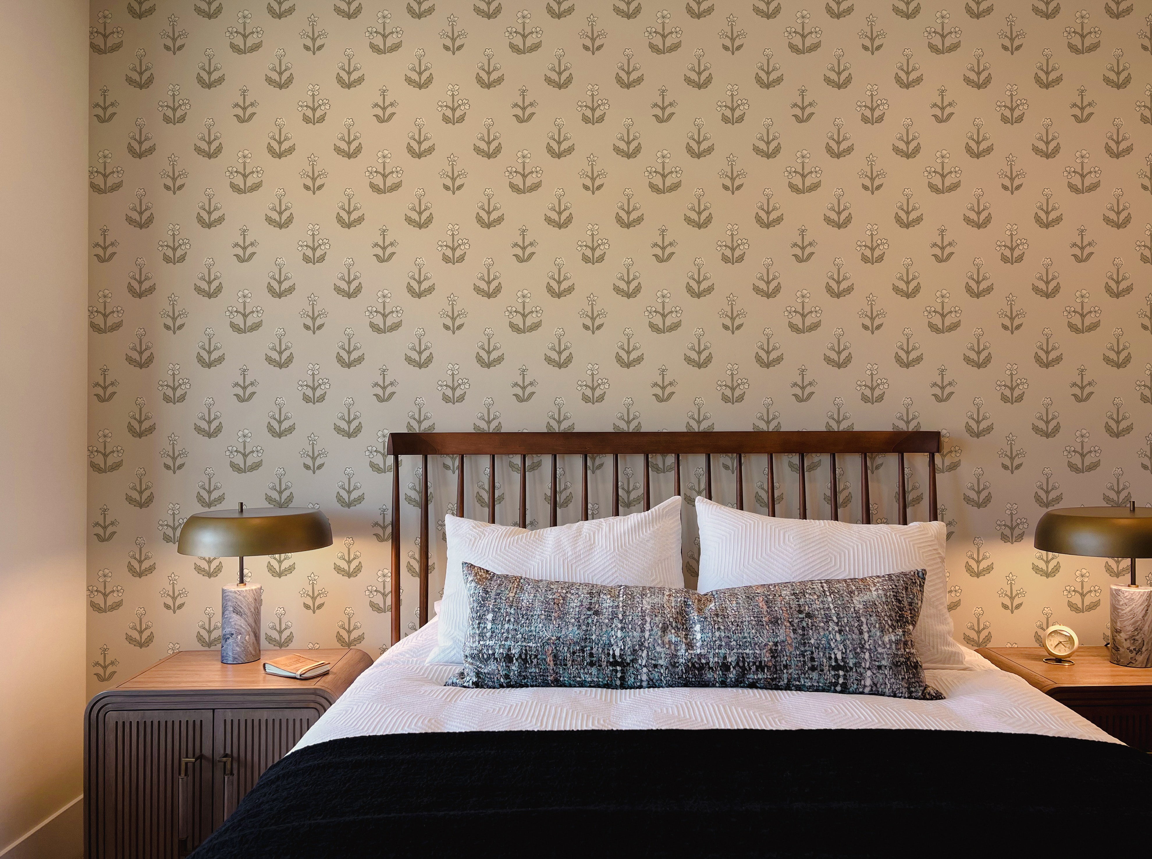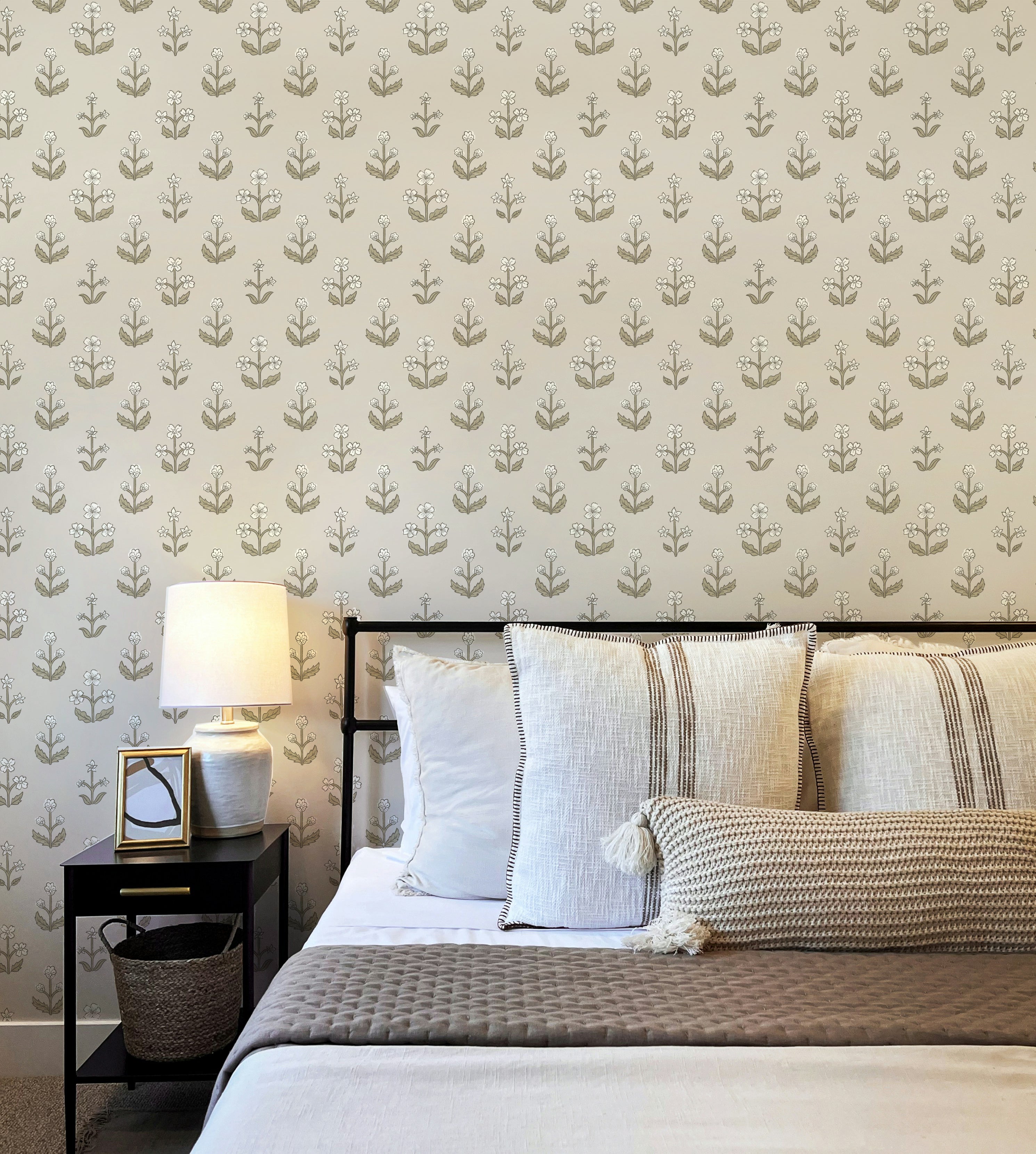 This block print floral wallpaper is ideal for bedrooms, nurseries, powder rooms, hallways, and reading nooks where subtle pattern adds warmth without overwhelming the room. The evenly spaced repeat creates a gentle rhythm on the wall, making it a great choice for full room installations or smaller accent areas.