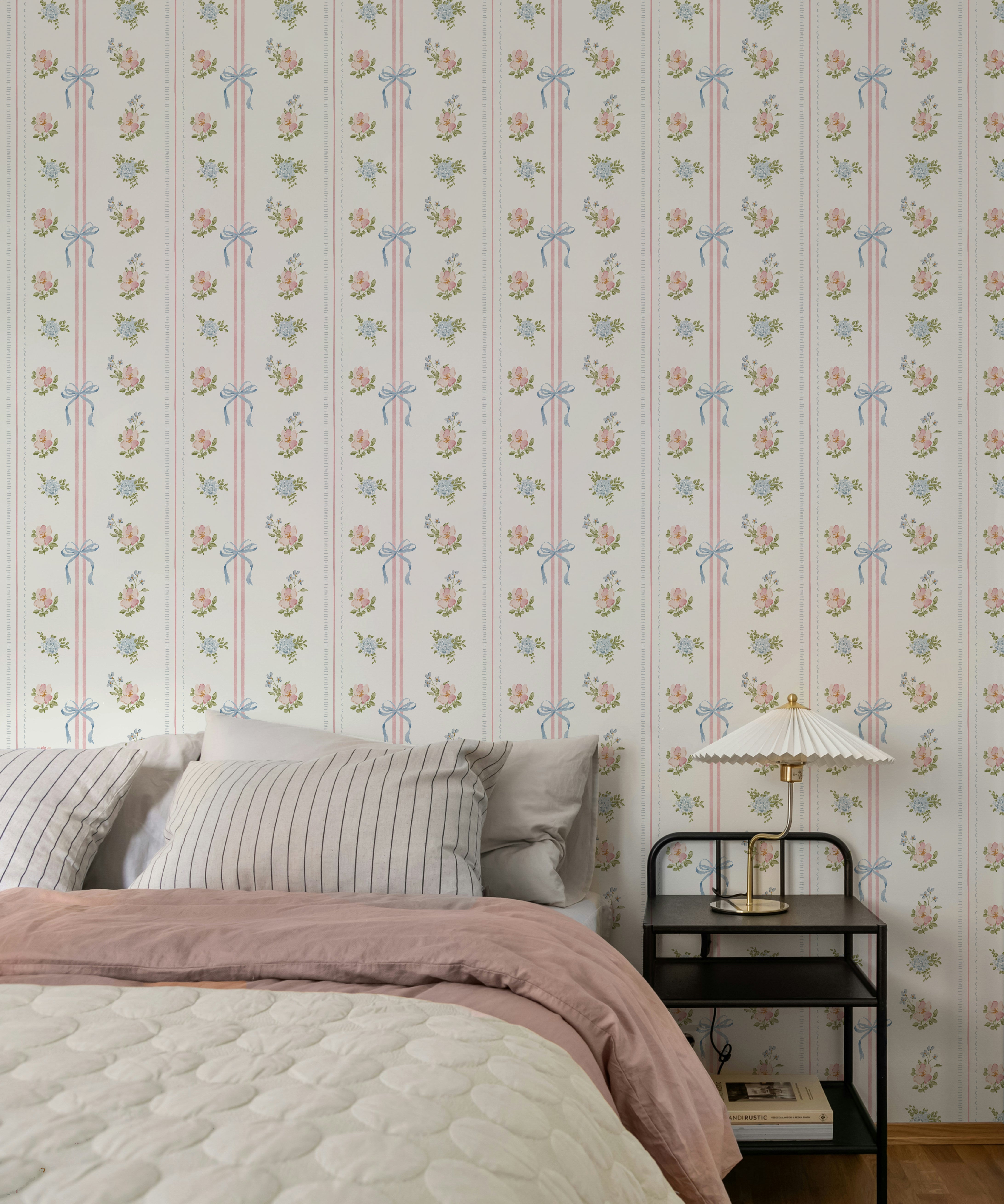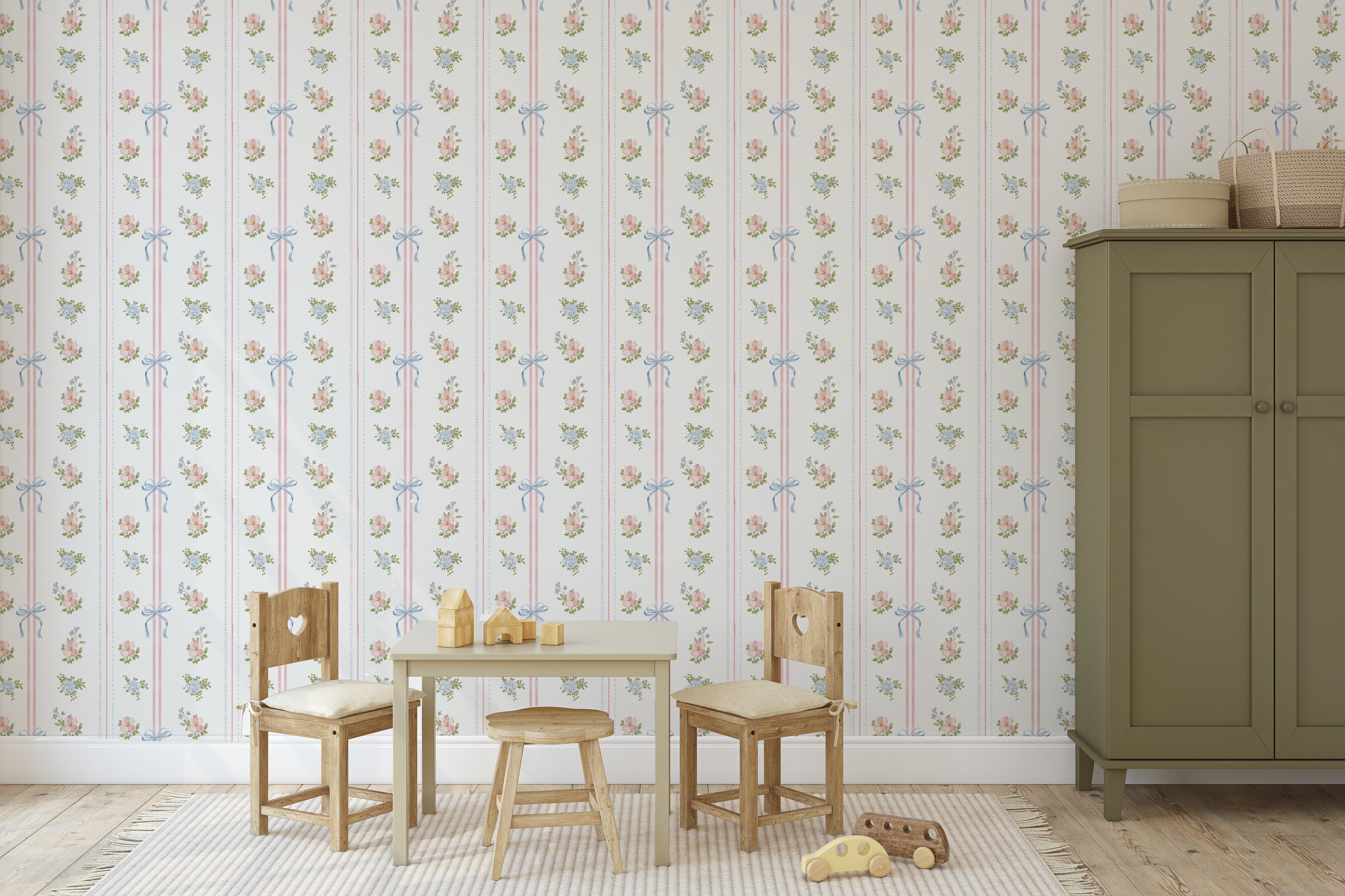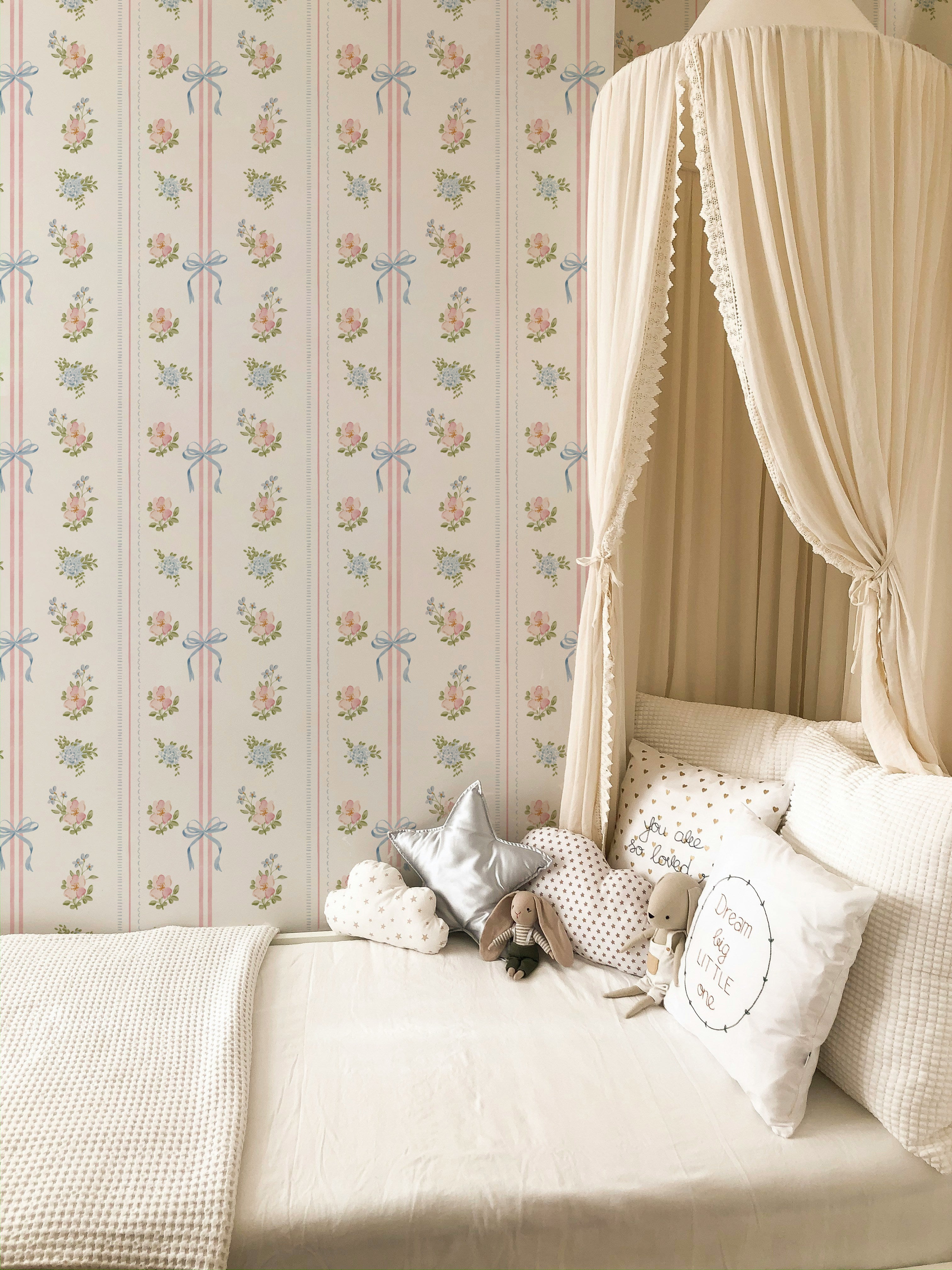 Perfect for nurseries, toddler rooms, and classic children’s spaces, our Petite Bow Garden Wallpaper pairs beautifully with natural textures, soft linens, and vintage inspired decor. It works just as well on all four walls as it does as an accent wall behind a crib or bed!