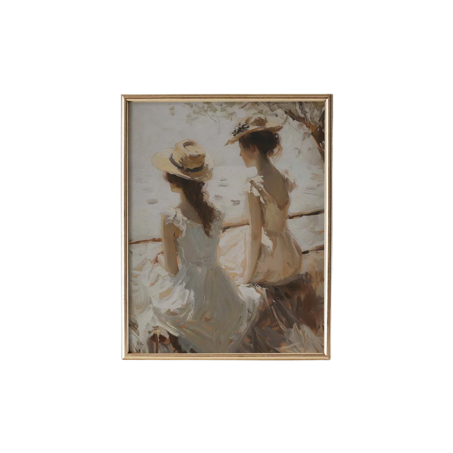 A quiet moment, captured in soft strokes of light and warmth. Our Summer’s Gaze art print evokes the nostalgia of sunlit afternoons by the water, where time slows and the air hums with tranquility. Two figures sit in quiet reflection, their delicate dresses and woven hats blending seamlessly with the golden glow of summer. This timeless piece brings a sense of serenity and elegance to any space, making it perfect for those who appreciate vintage charm and painterly beauty.