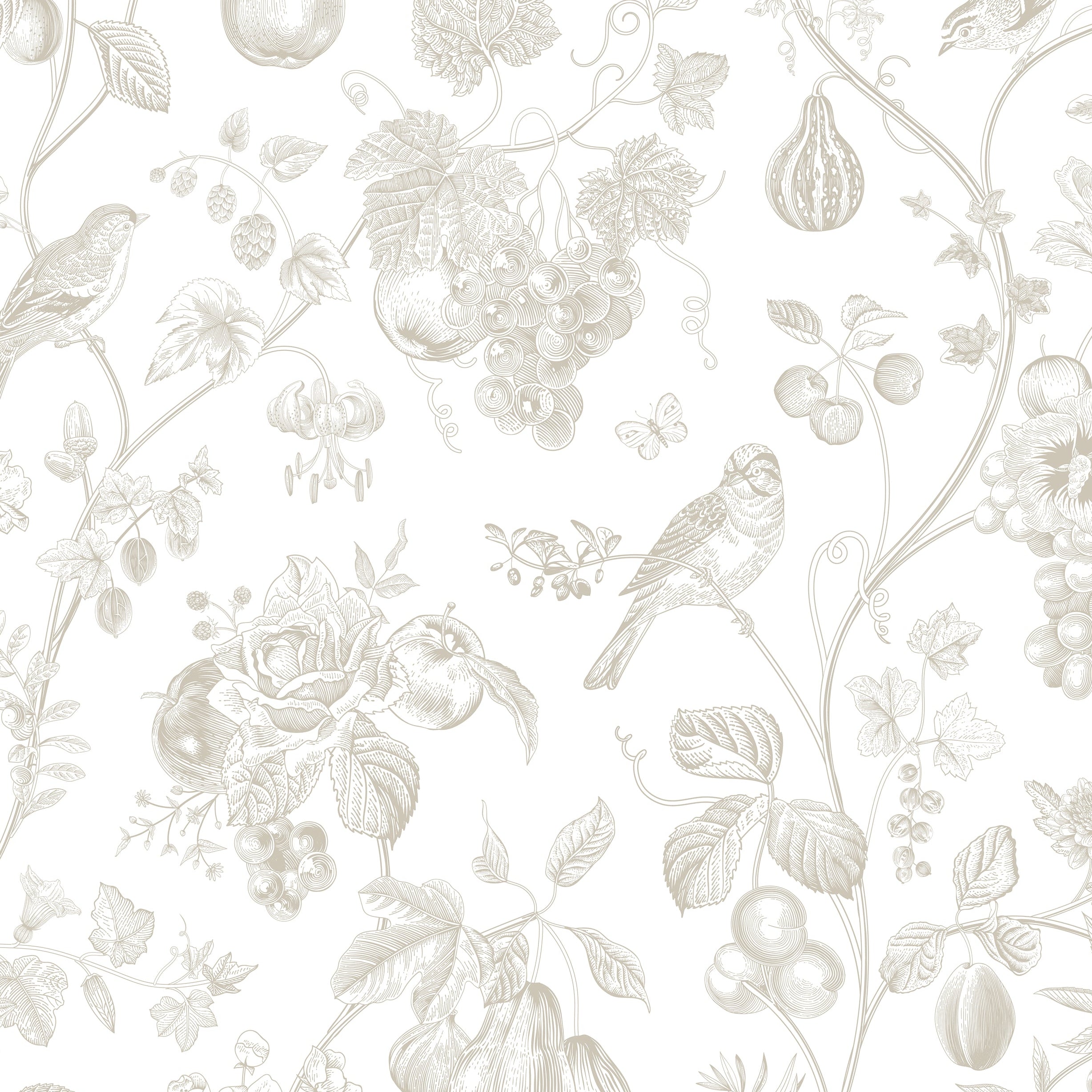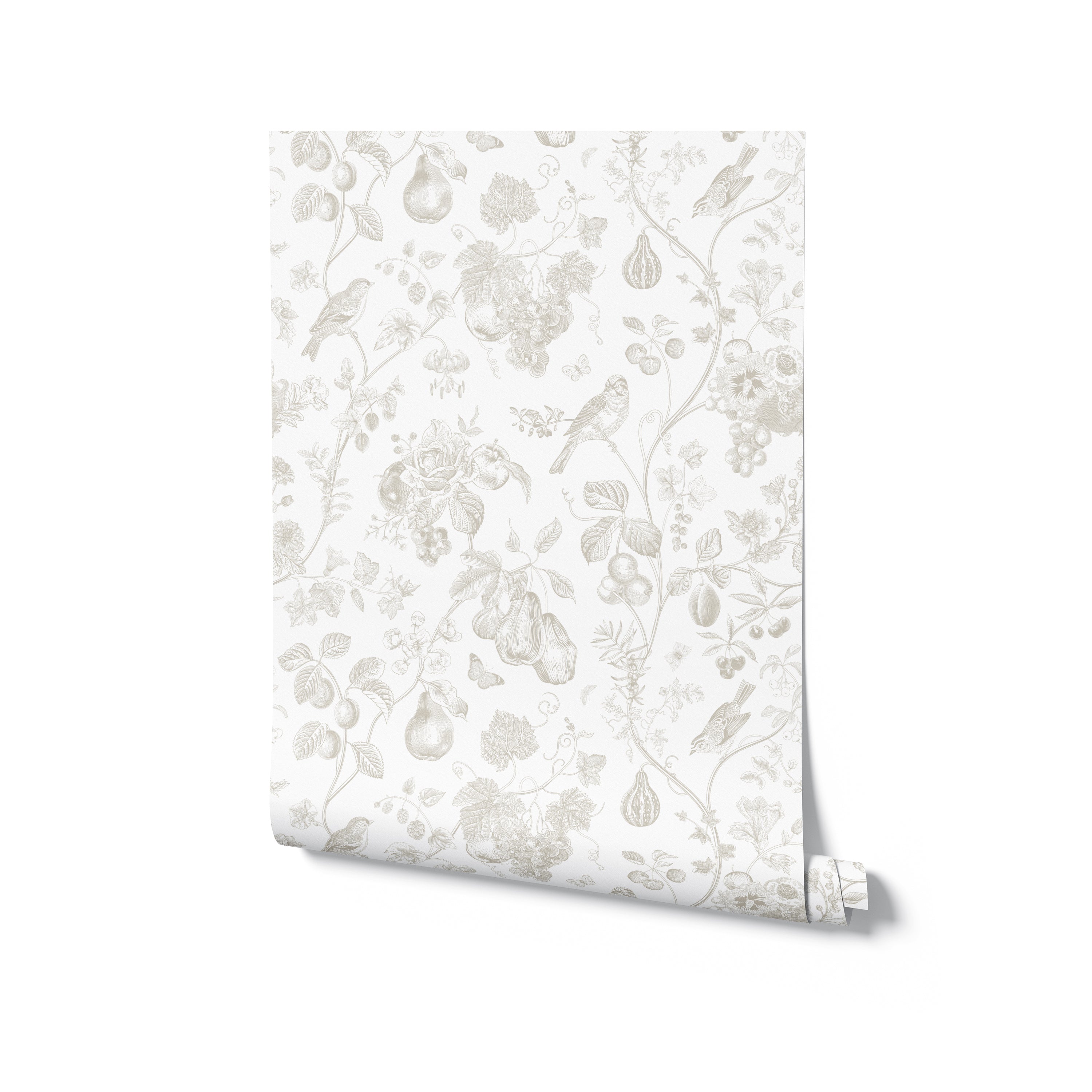 Softly illustrated and rich in detail, our Orchard Branches Wallpaper features winding vines filled with fruit, florals, and perched birds. The design draws inspiration from traditional botanical illustrations and vintage toile patterns, reimagined for modern interiors.