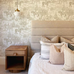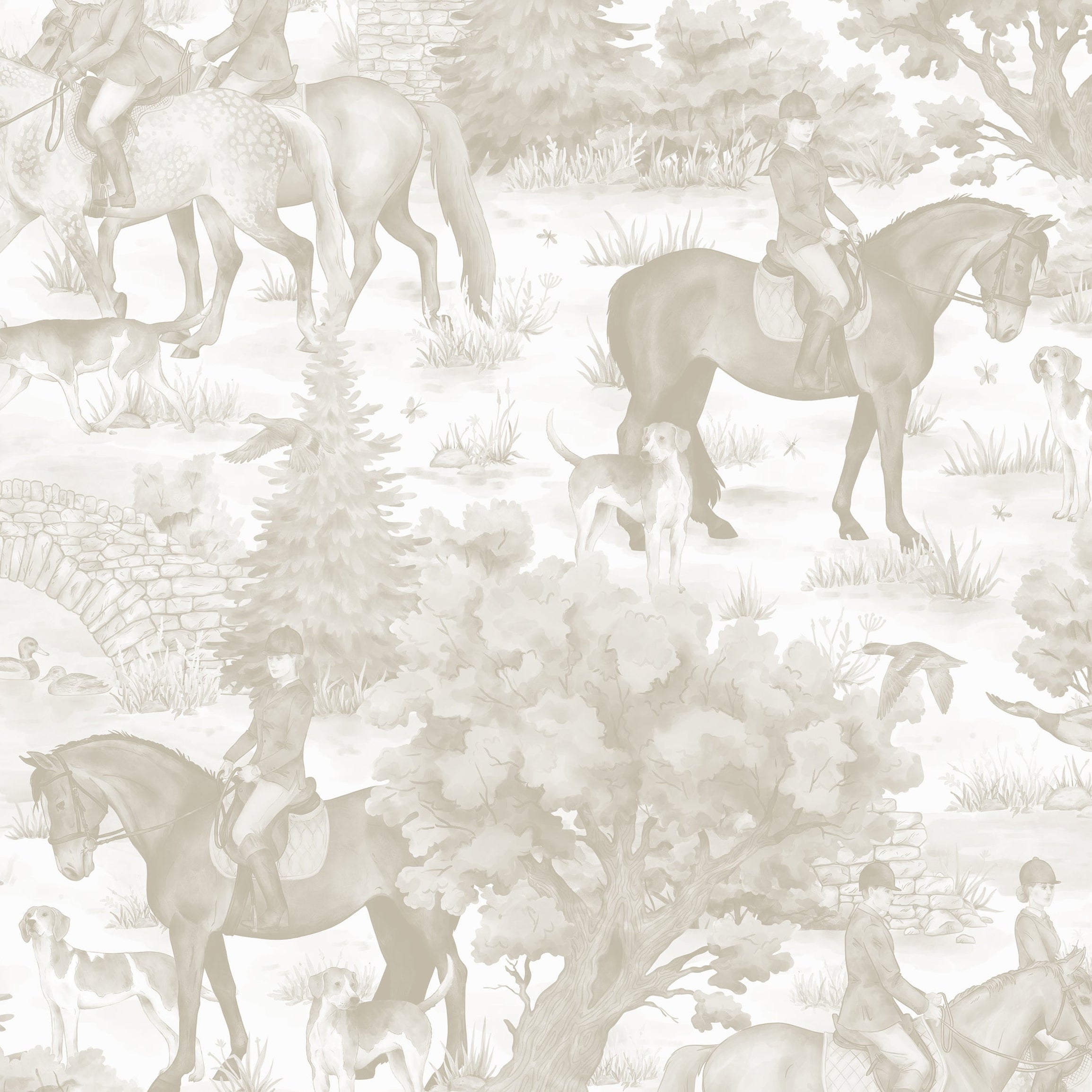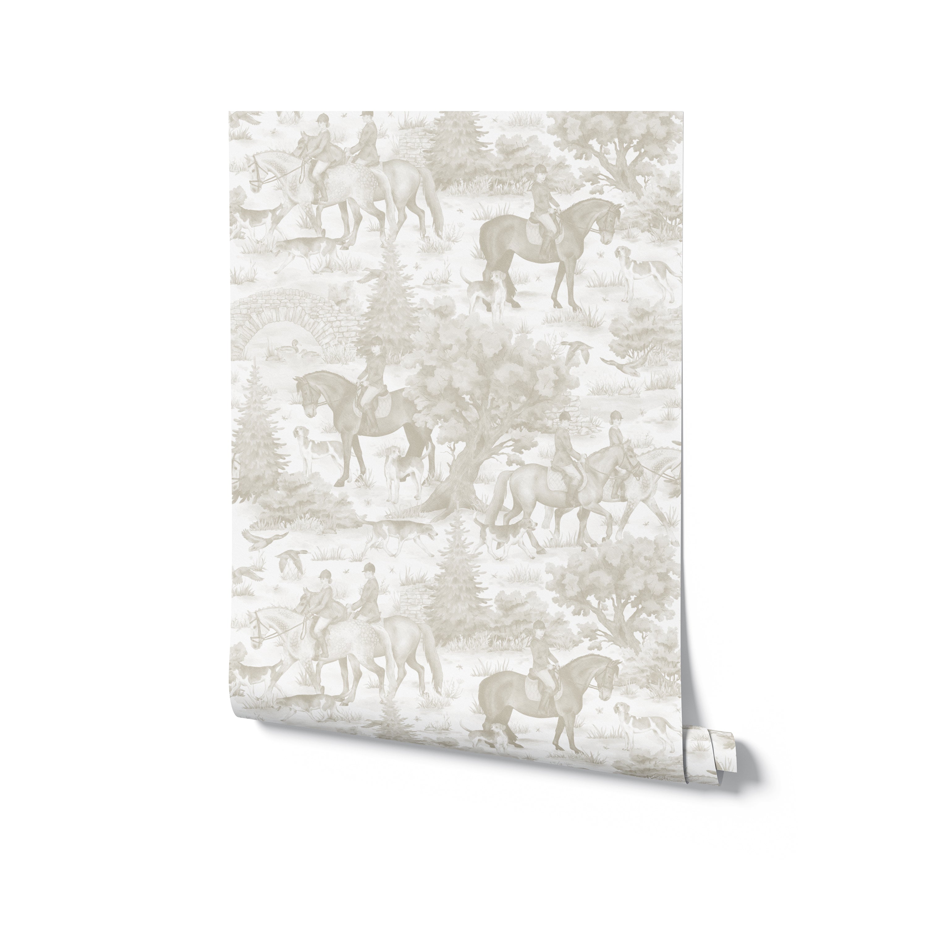Inspired by classic European countryside scenes, our Riding Grounds Wallpaper features a hand painted design, customizable to your colour of choice. Horses, riders, trees, and stone bridges repeat gently across the design, creating visual interest without overwhelming the space.