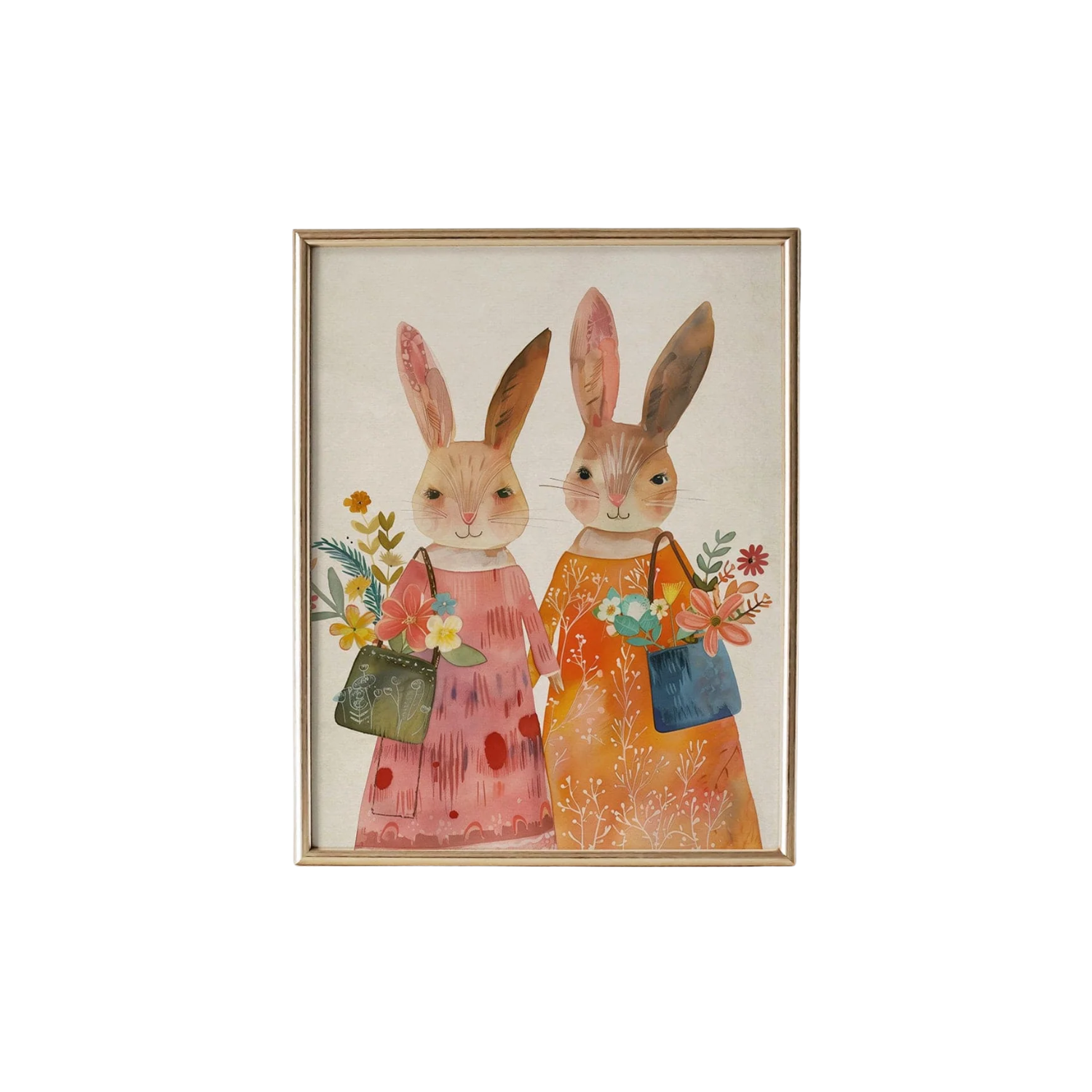 Add a touch of whimsy to your child's room with our charming Floral Bunny Friends Art Print from the Timberlea Interiors Kids Art Print Collection. This delightful artwork features two adorable bunnies dressed in colorful outfits and holding flower-filled bags, surrounded by vibrant floral accents. Perfect for nurseries, playrooms, and bedrooms, this high-quality print brings a joyful and playful atmosphere to any space. Available in various frame options to match your decor, this art print is designed to inspire imagination and delight in young hearts. Elevate your child's room decor with this enchanting piece that celebrates friendship and the beauty of nature.