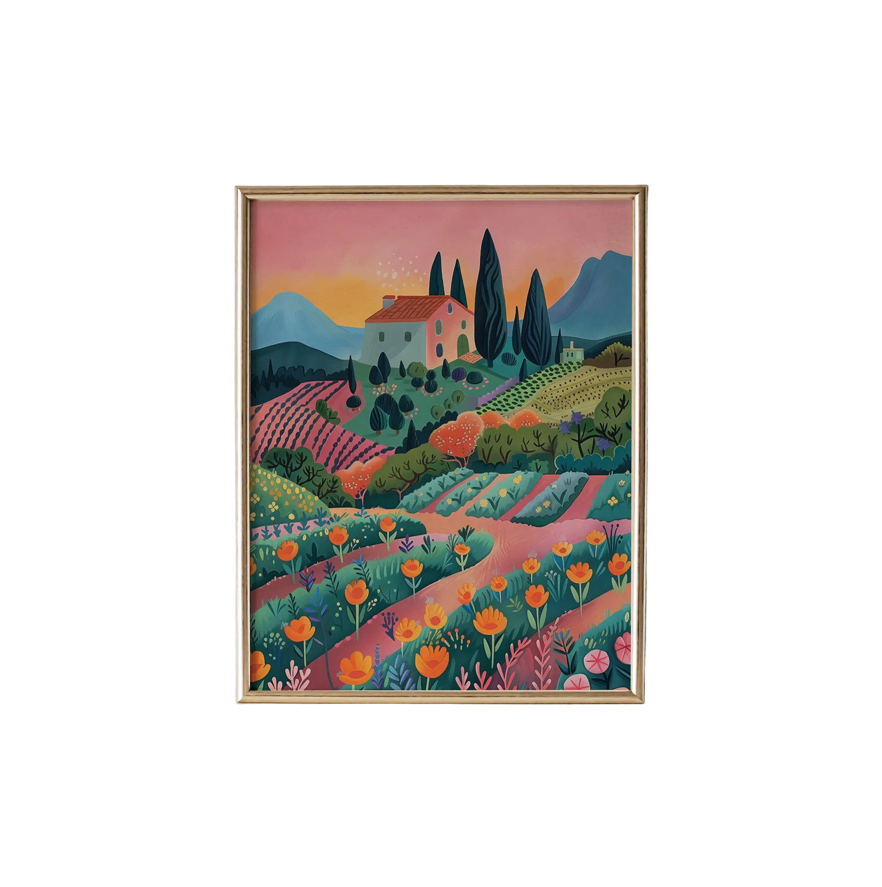 Infuse your child's room with the beauty and charm of the countryside with our Sunset Vineyard Art Print from the Timberlea Interiors Kids Art Print Collection. This vibrant print features a picturesque vineyard bathed in the warm glow of a setting sun, with lush fields of colorful flowers and a quaint farmhouse nestled in the hills. The rich, vivid colors and intricate details create a captivating and serene scene, perfect for inspiring a love for nature and the outdoors. The high-quality print captures the stunning hues and delicate brushstrokes, making it a standout piece for nurseries, playrooms, or any space that needs a touch of pastoral beauty. Printed on durable, premium paper, this art print promises to be a long-lasting addition to your home. Easy to frame and hang, it’s an effortless way to bring the tranquility and vibrancy of the countryside into your child's world.