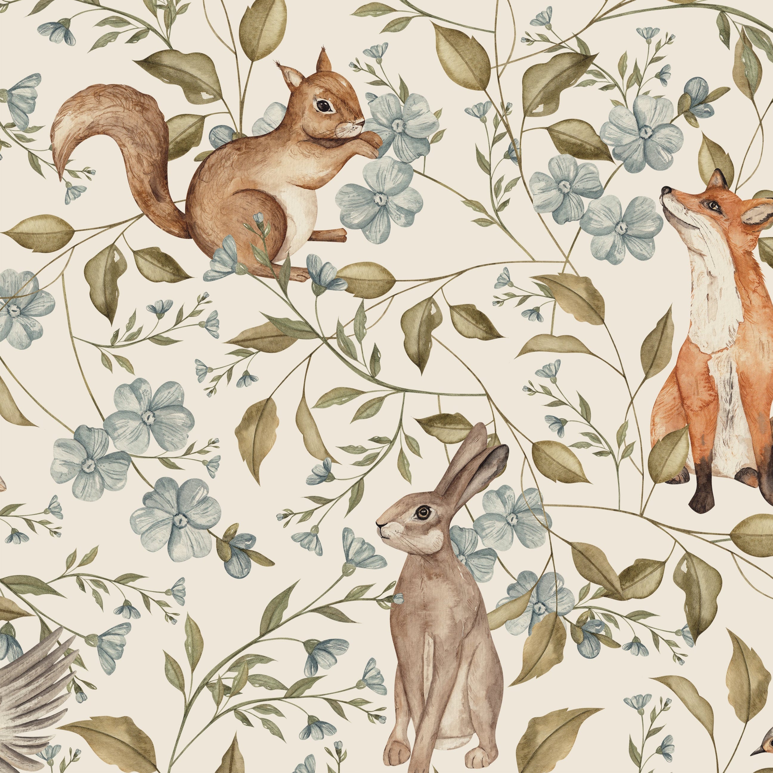 Introducing our Forest Tales wallpaper, a captivating design that brings the enchanting world of the forest into your home. This wallpaper features charming woodland creatures, including squirrels, foxes, and rabbits, nestled among delicate blue flowers and lush greenery. The intricate watercolour illustrations create a serene and whimsical atmosphere, perfect for adding a touch of nature-inspired magic to any room