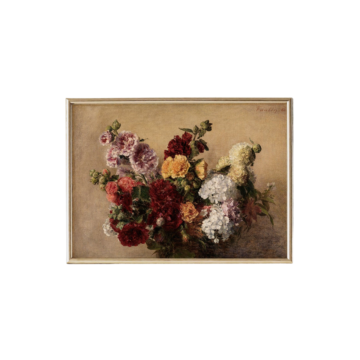 Add a burst of color and timeless elegance to your home with the "Malvenstrauss" (1882) vintage art print by renowned French artist Henri Fantin-Latour. This exquisite piece showcases a vibrant bouquet of hollyhocks in rich reds, yellows, and whites, set against a subtle beige background. Fantin-Latour's masterful brushwork and attention to detail bring the flowers to life, making this artwork a stunning focal point in any room.