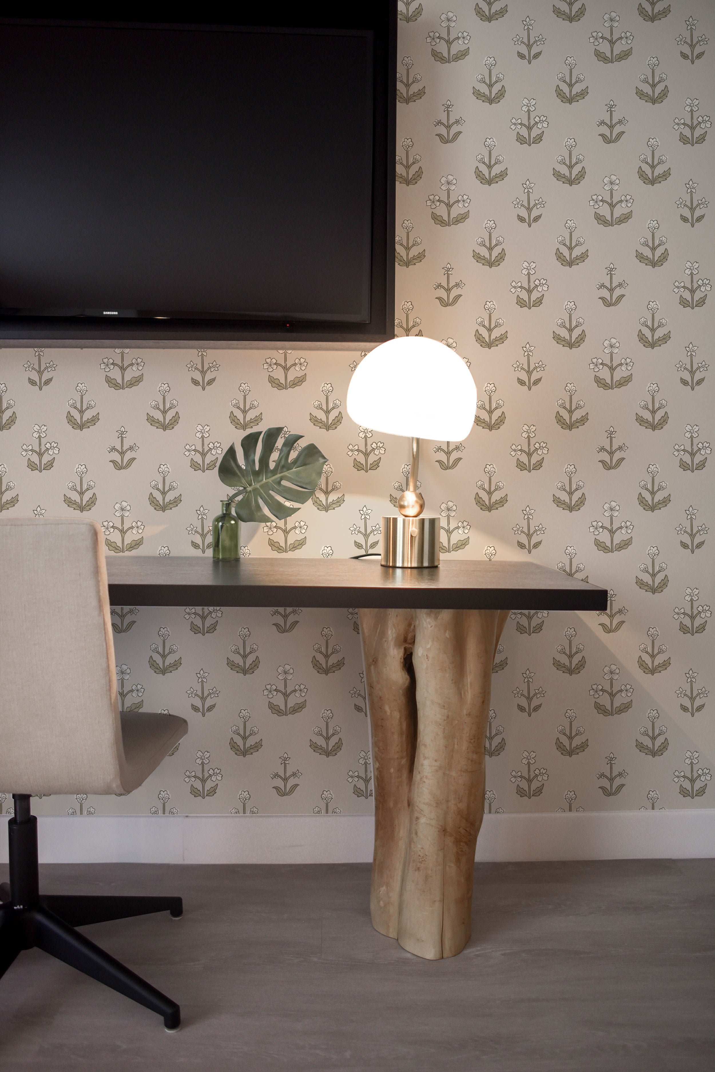 A section of 'Flower Power' wallpaper in a soft champagne color with white floral patterns, applied to a wall behind a shelf with a potted orchid, clear glass bottles, and candles