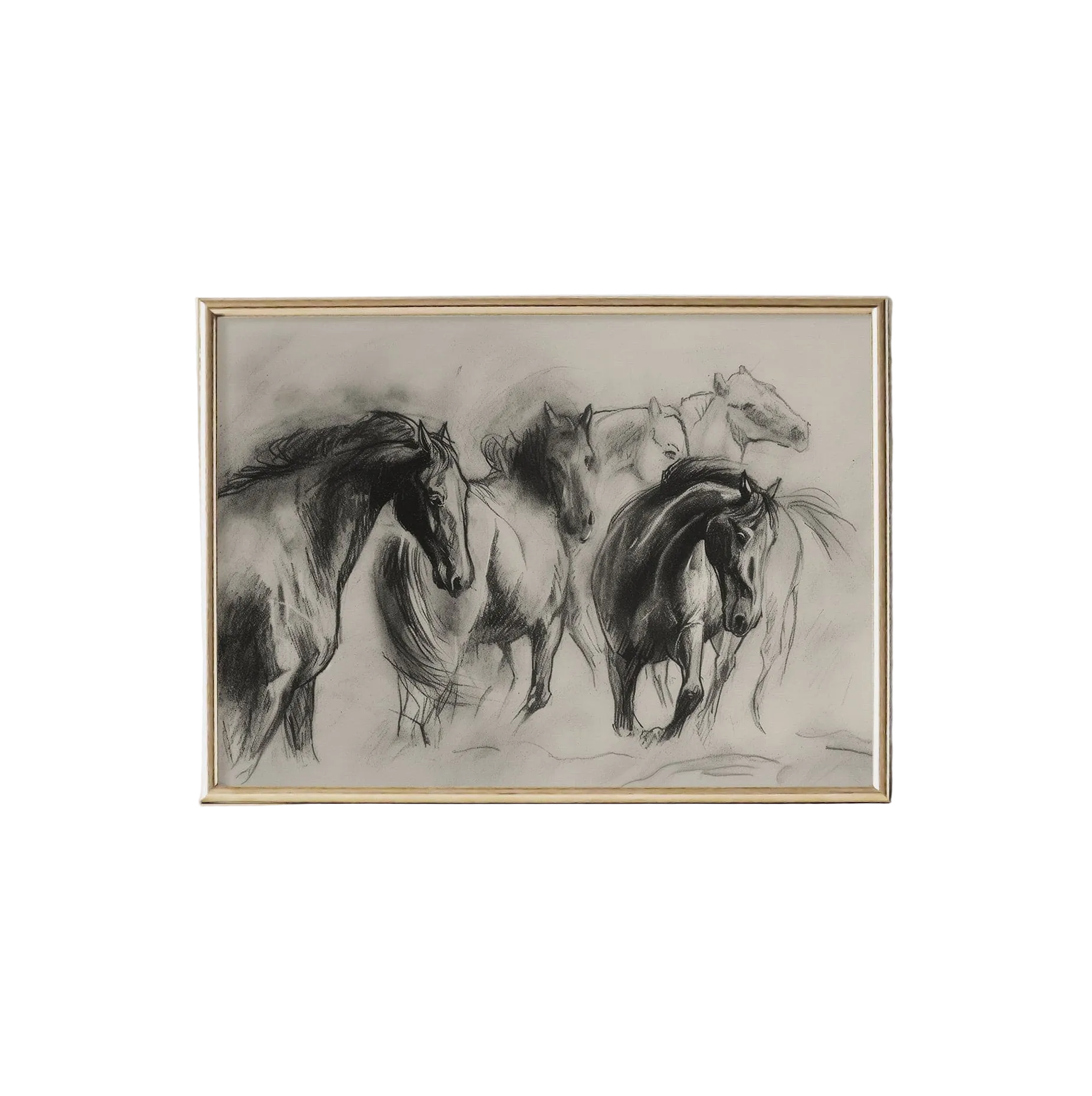 A striking tribute to freedom and power, our Wild Spirit art print captures the raw energy of horses in motion. Rendered in expressive charcoal strokes, this art print brings to life a herd galloping with unrestrained grace, their forms dissolving into shadows and light. The dynamic composition evokes movement and emotion, making it a captivating statement piece for any space. Perfect for those who appreciate the beauty of nature, strength, and untamed elegance.