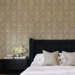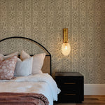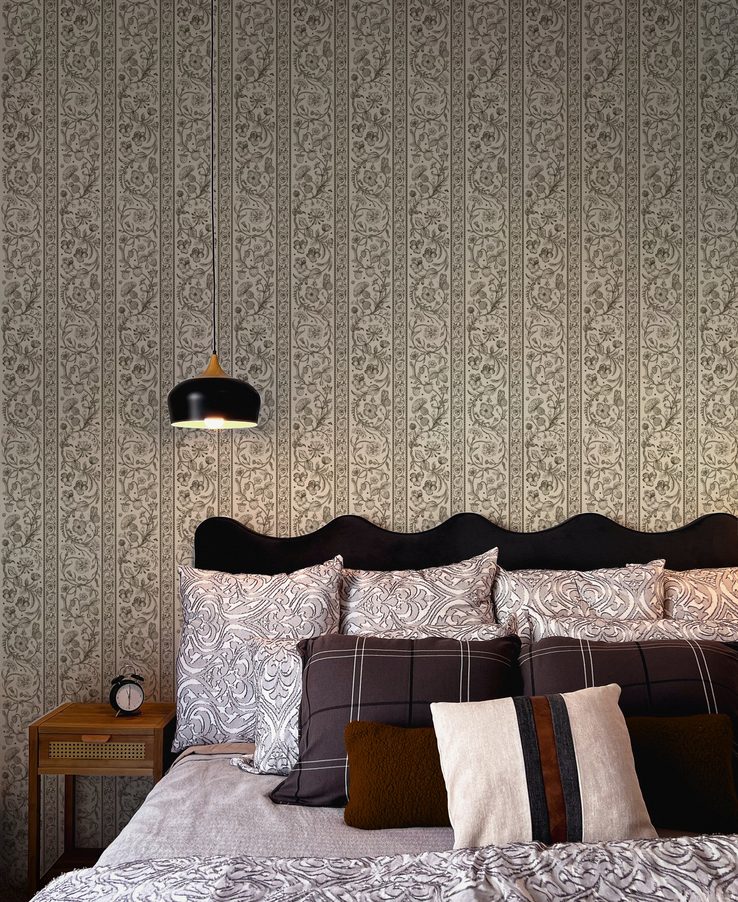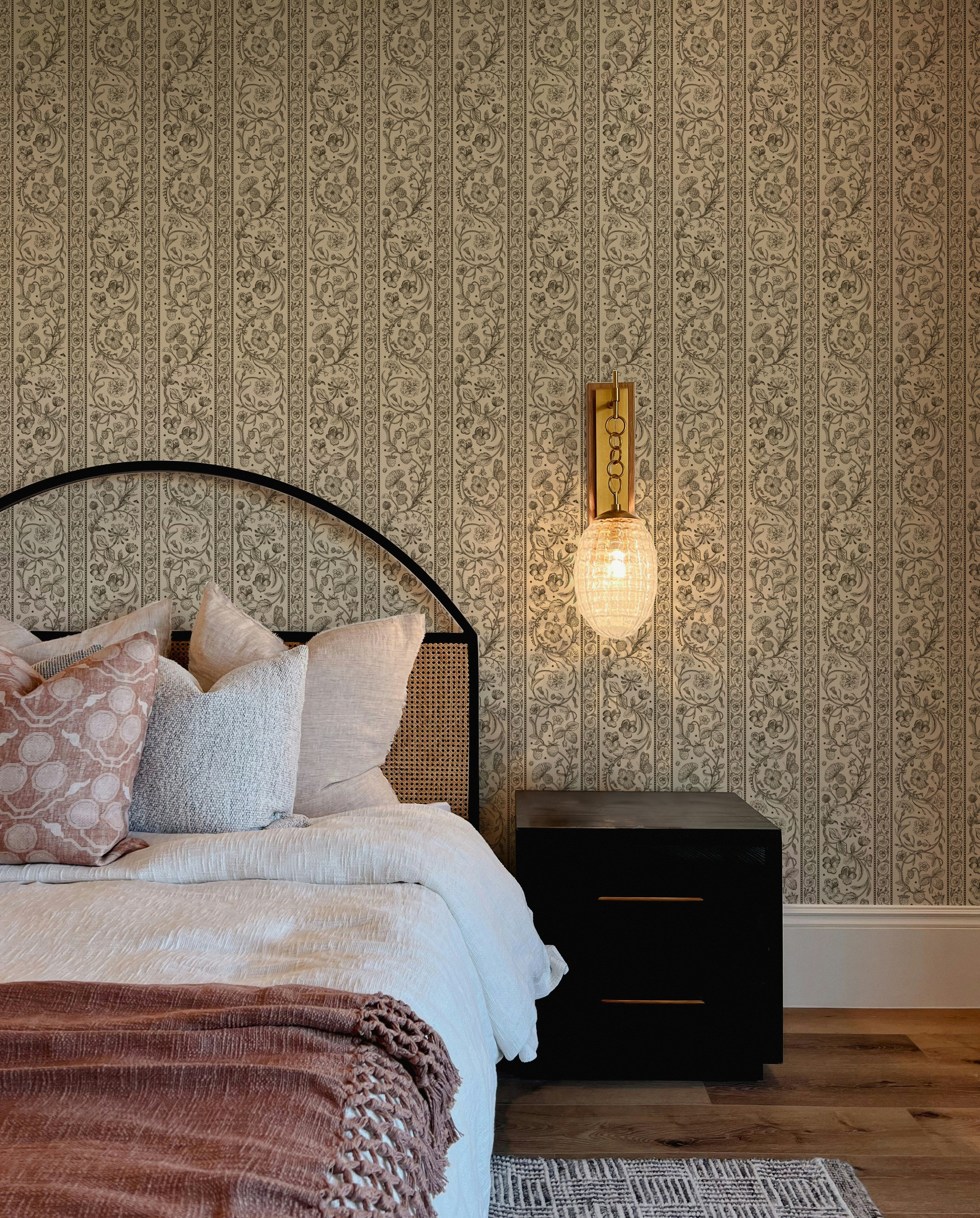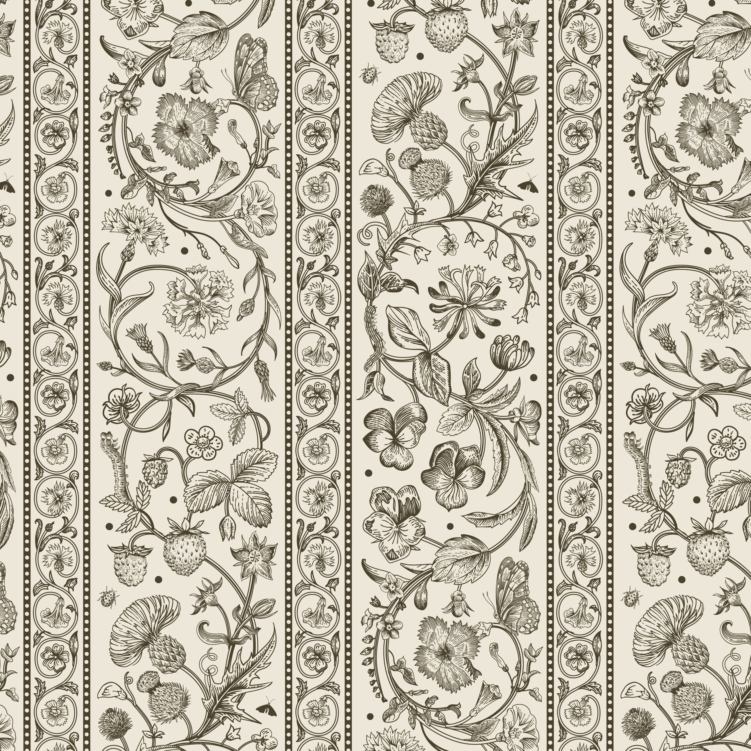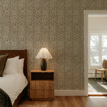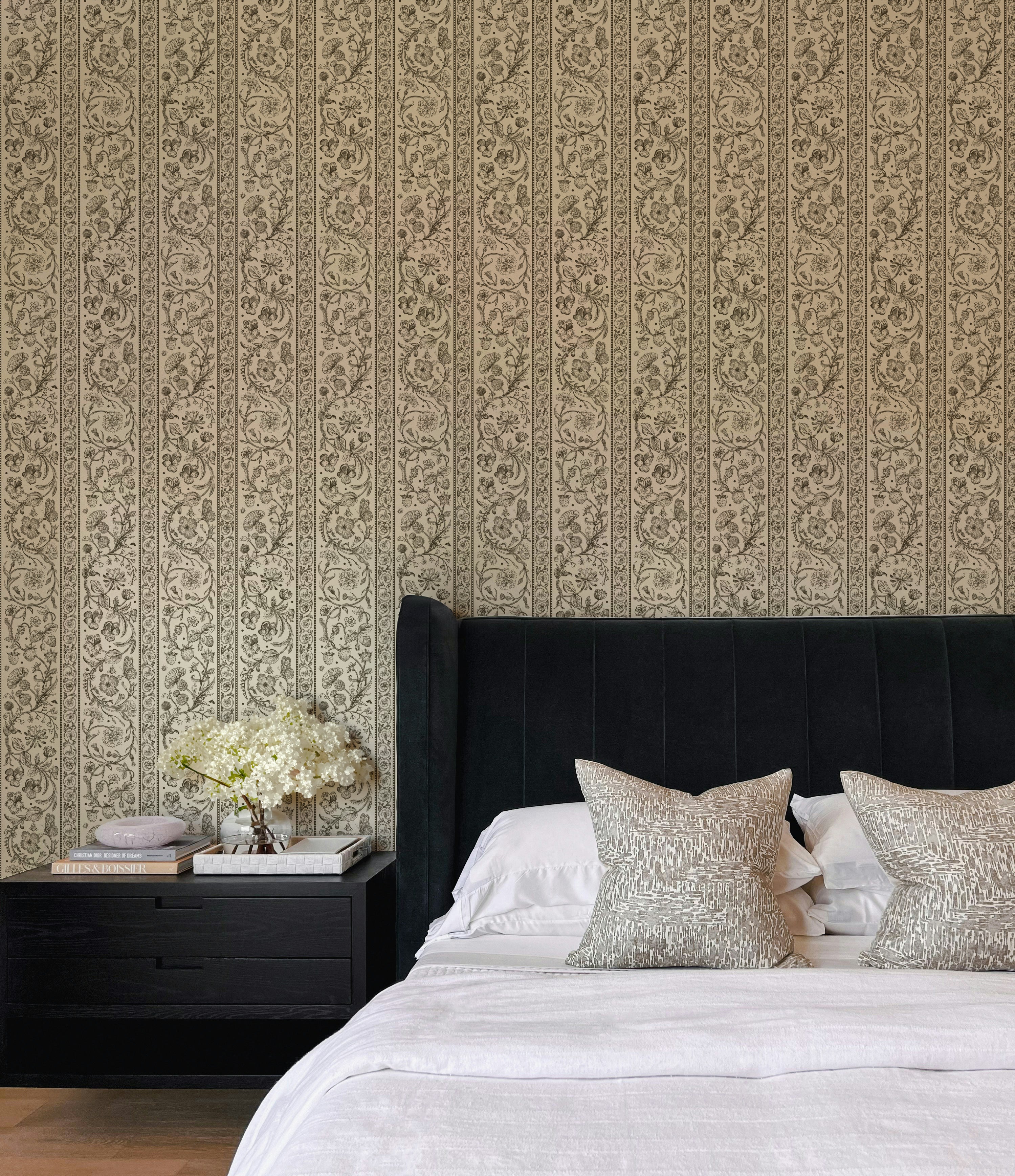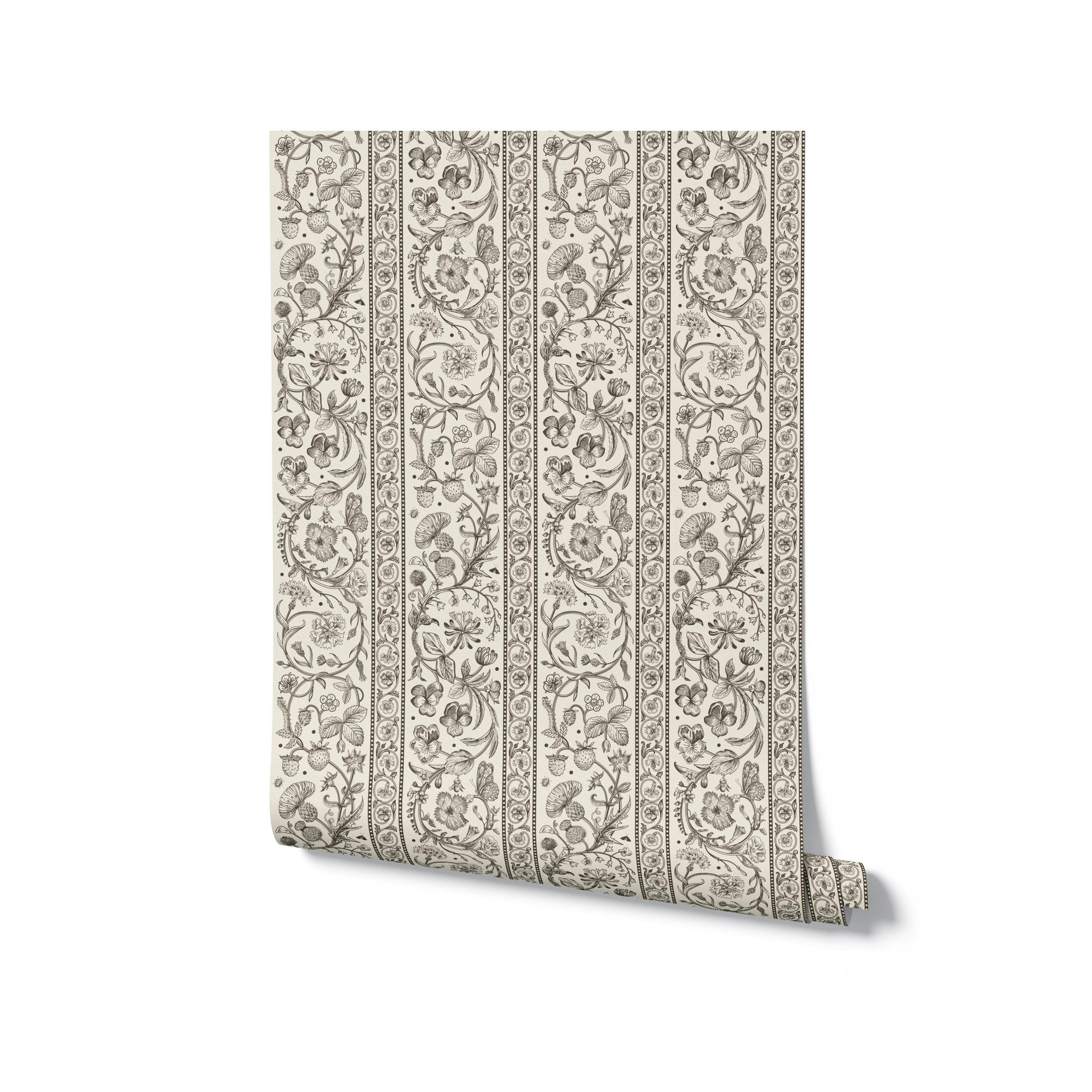 Our Botanical Stripe Wallpaper draws inspiration from antique textiles, blending delicate botanical illustrations with a classic play on stripes. Each stripe is filled with finely detailed florals, fruiting branches, and ornamental motifs, creating a pattern that feels intentional and one with nature.