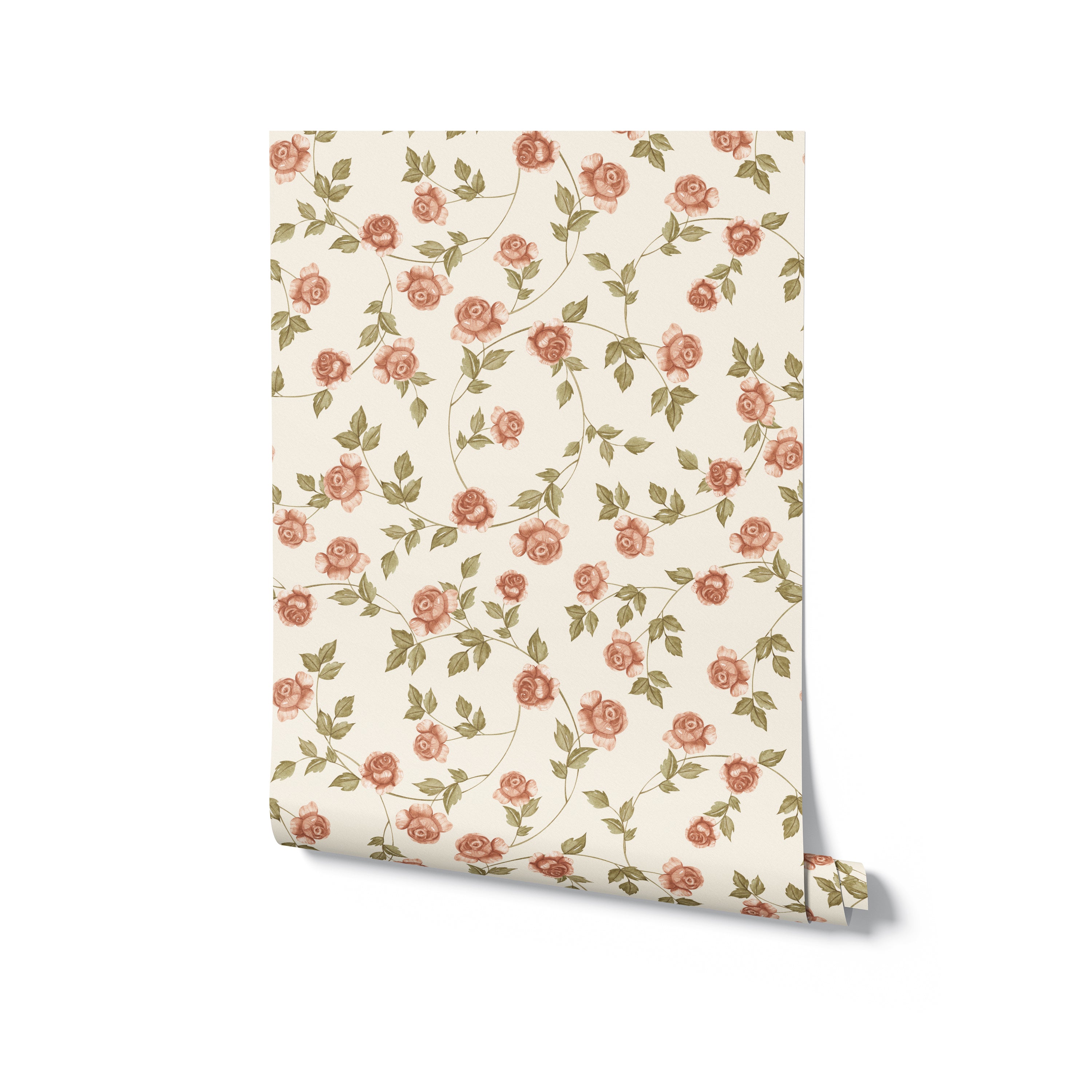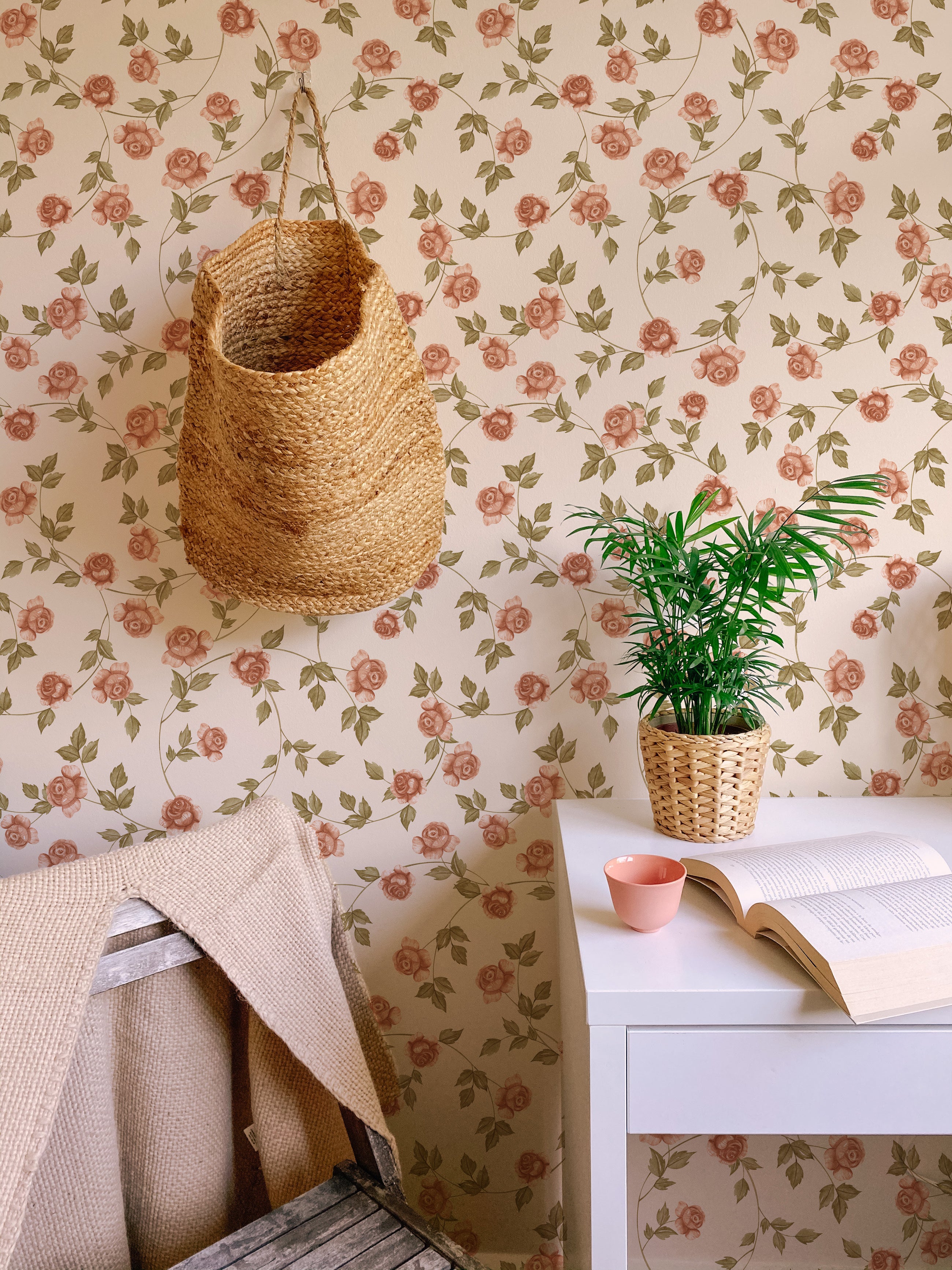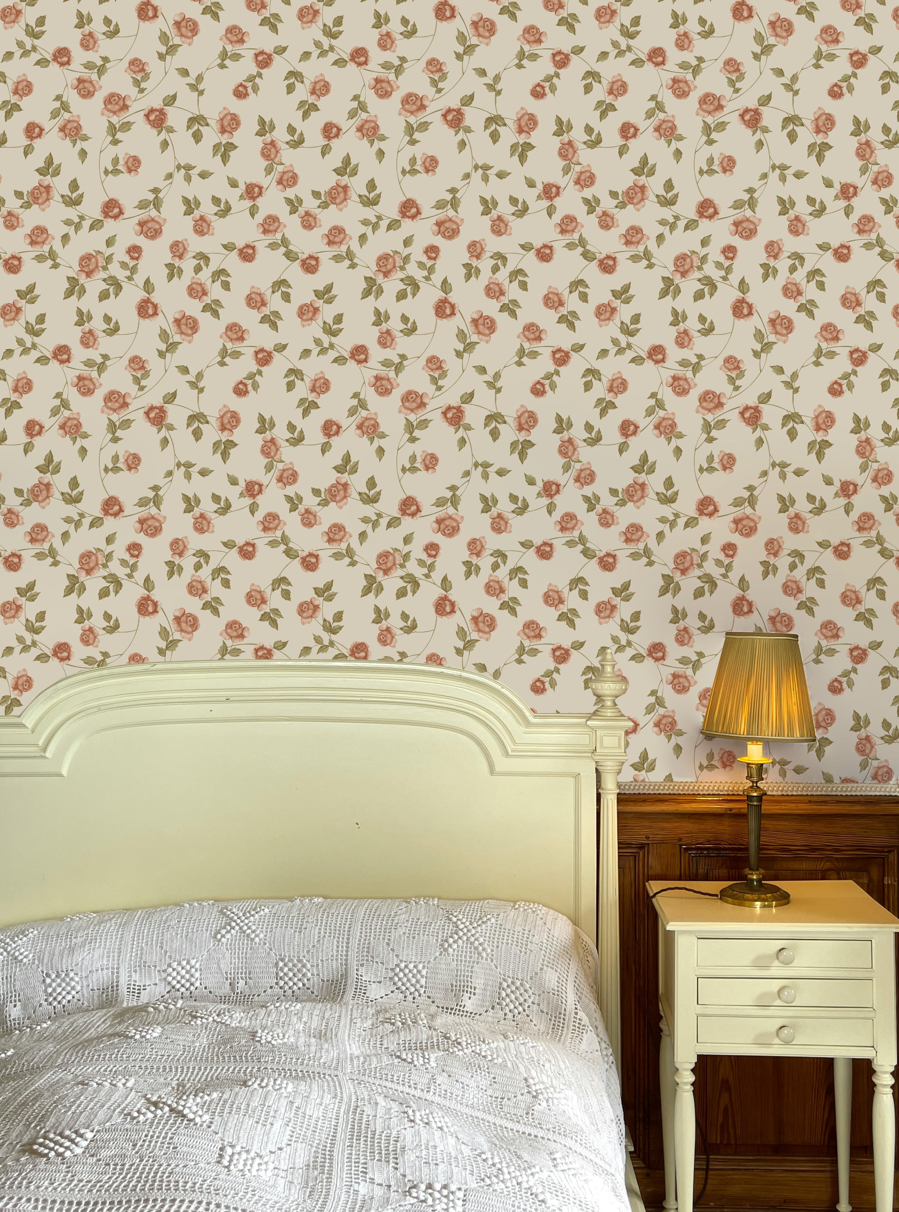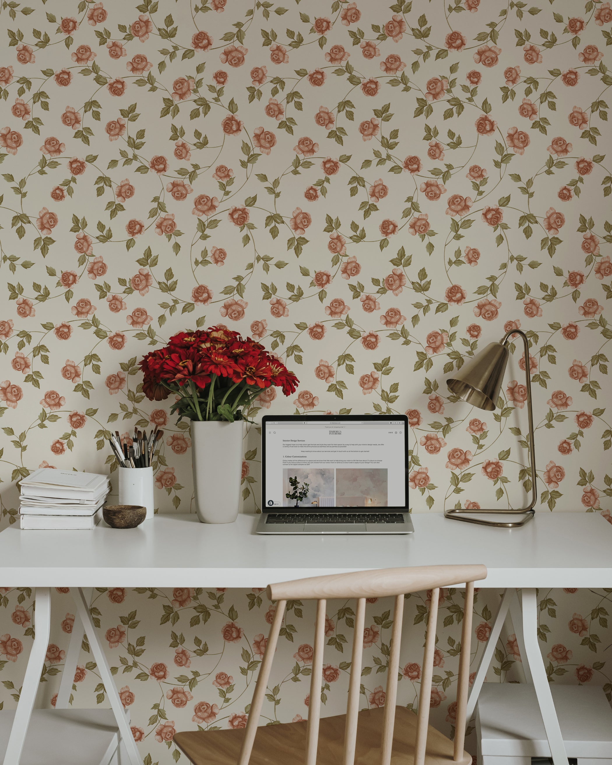 Our Cascading Roses brings the softness of a cottage garden indoors with delicate watercolour roses cascading across a warm cream backdrop. Each bloom is illustrated with vintage-inspired detail, creating a wallpaper that feels both nostalgic and fresh — perfect for nurseries, bedrooms, and cozy reading nooks.