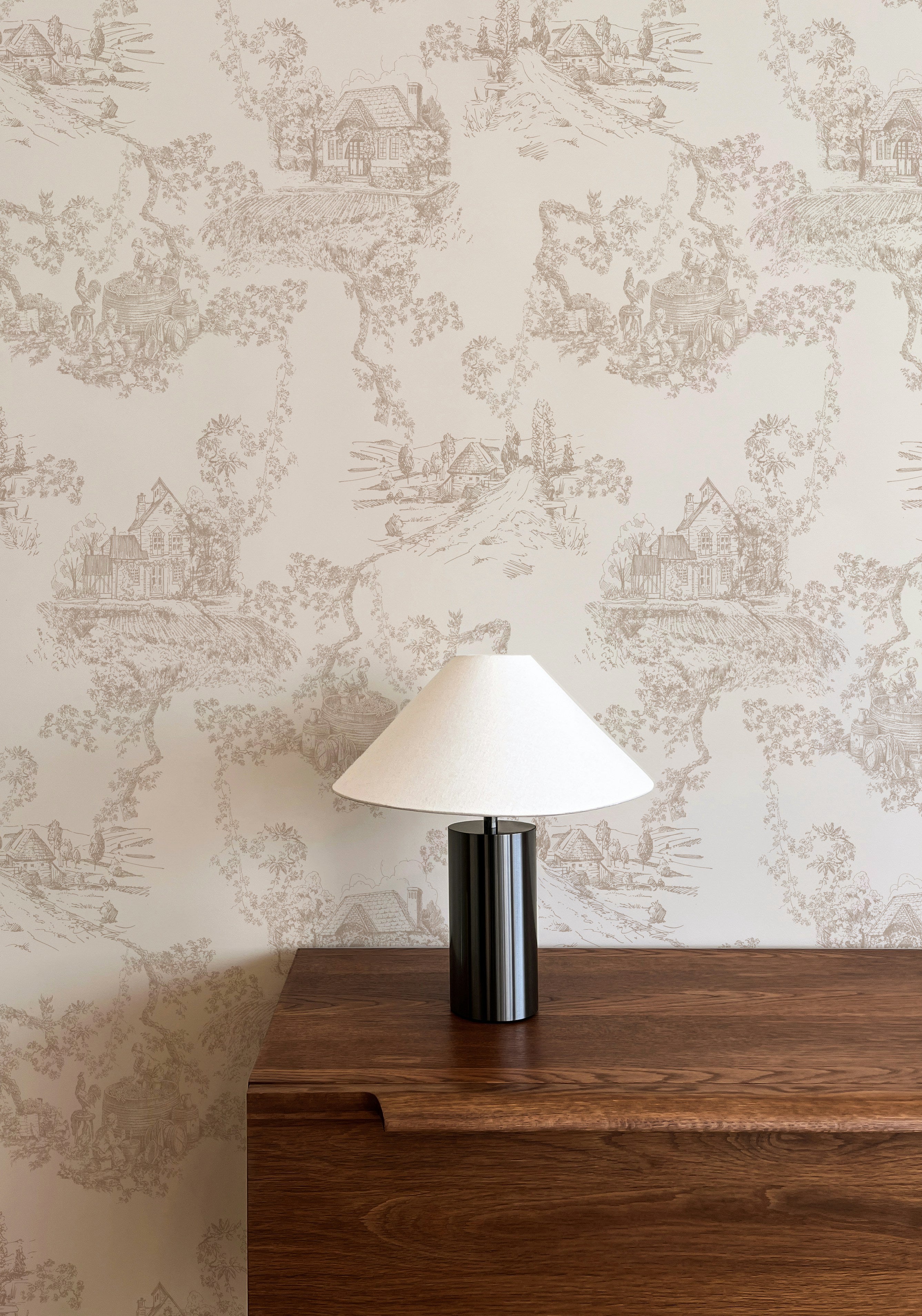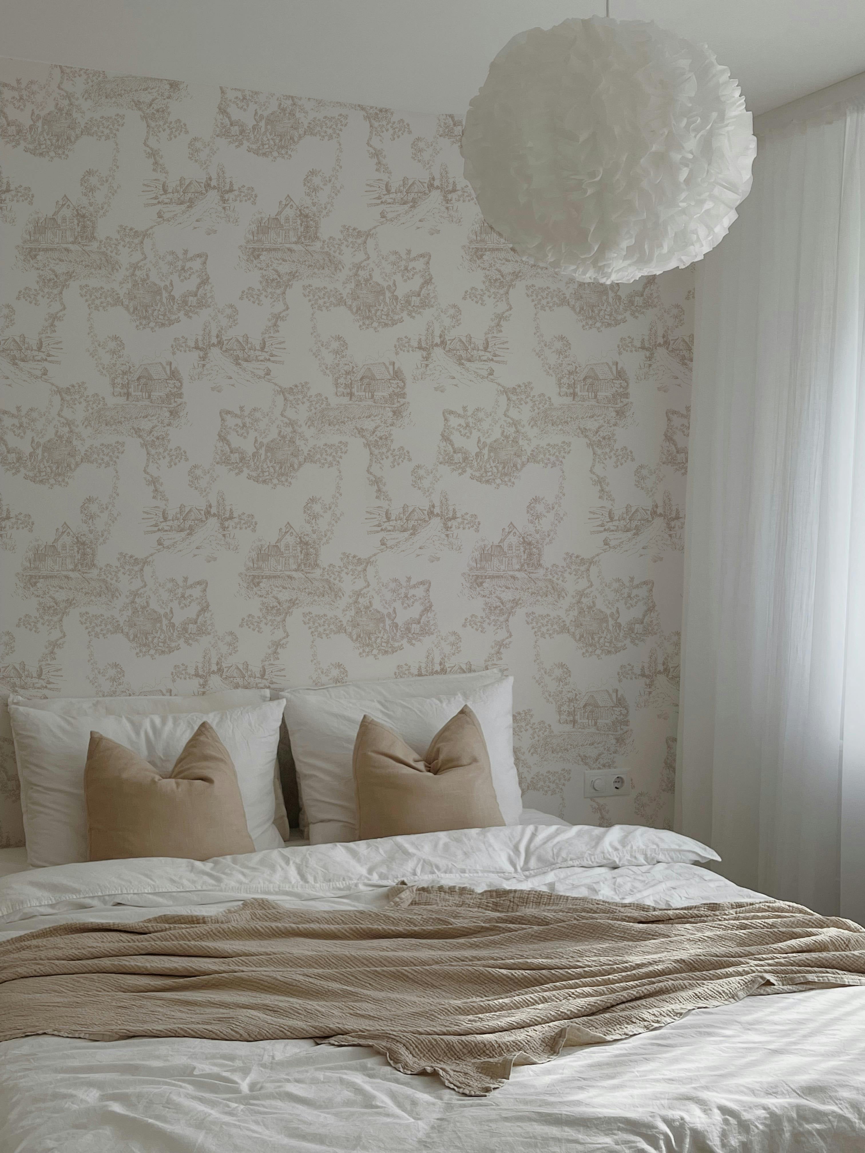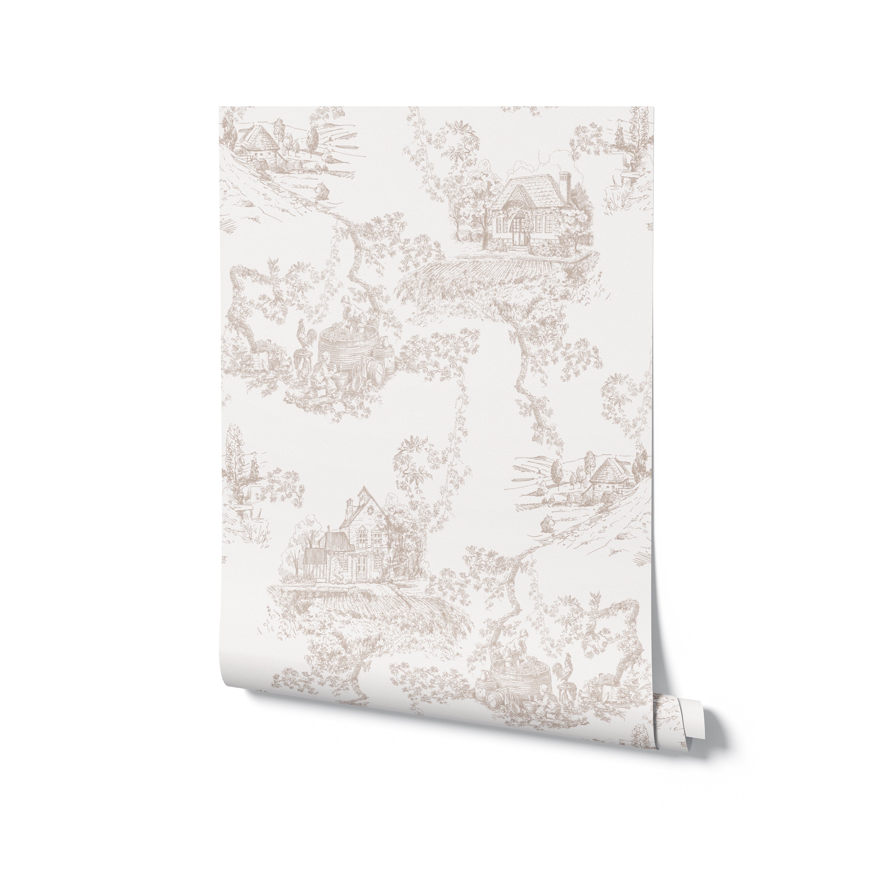 A countryside story told in soft, detailed linework — our Cottage Toile Wallpaper brings pastoral charm to your walls with a timeless touch. Inspired by vintage toile prints, it captures quiet scenes of cottages, winding paths, and gardens in bloom, all drawn in delicate neutral tones that blend effortlessly into modern and traditional interiors alike.