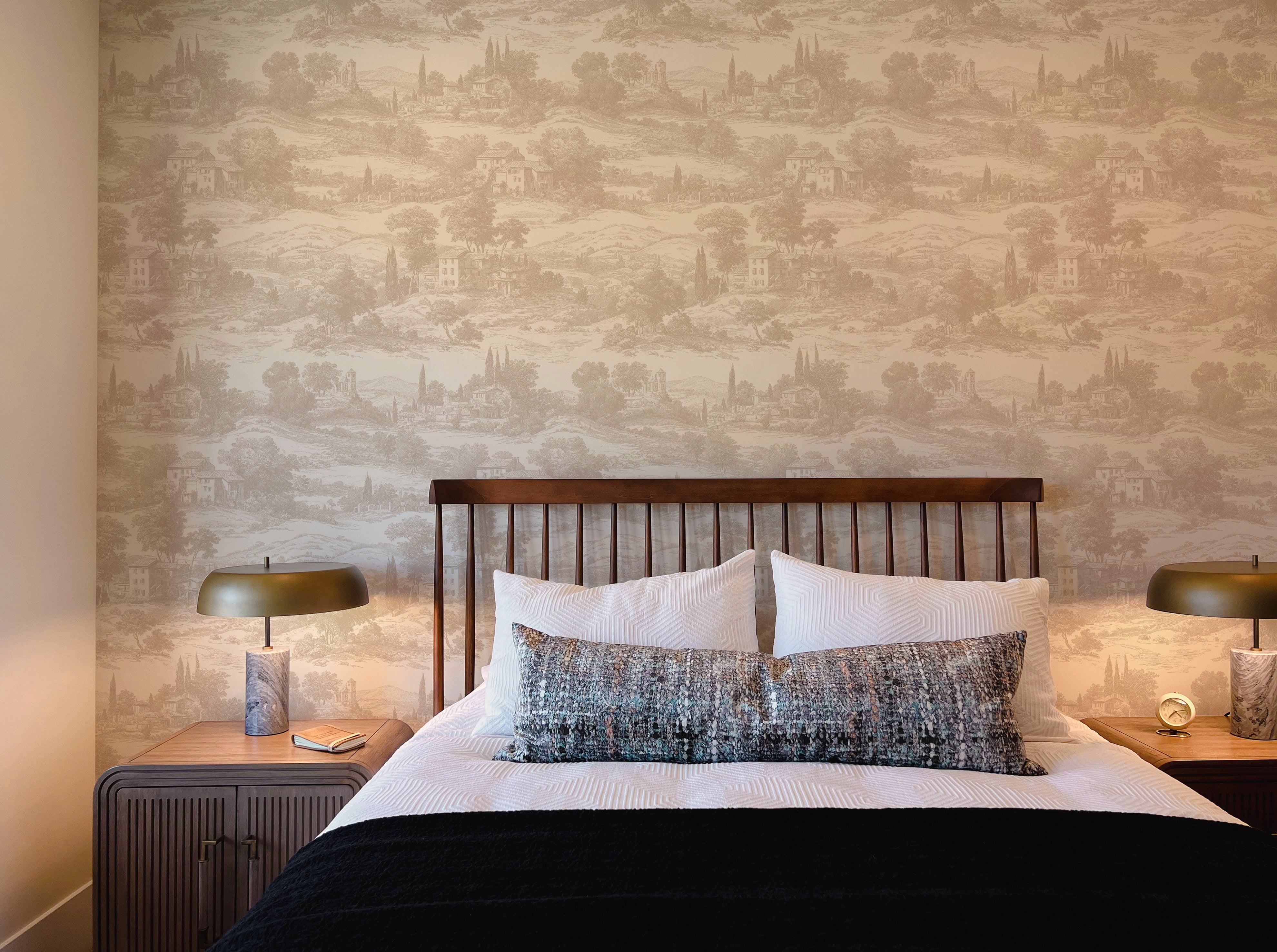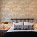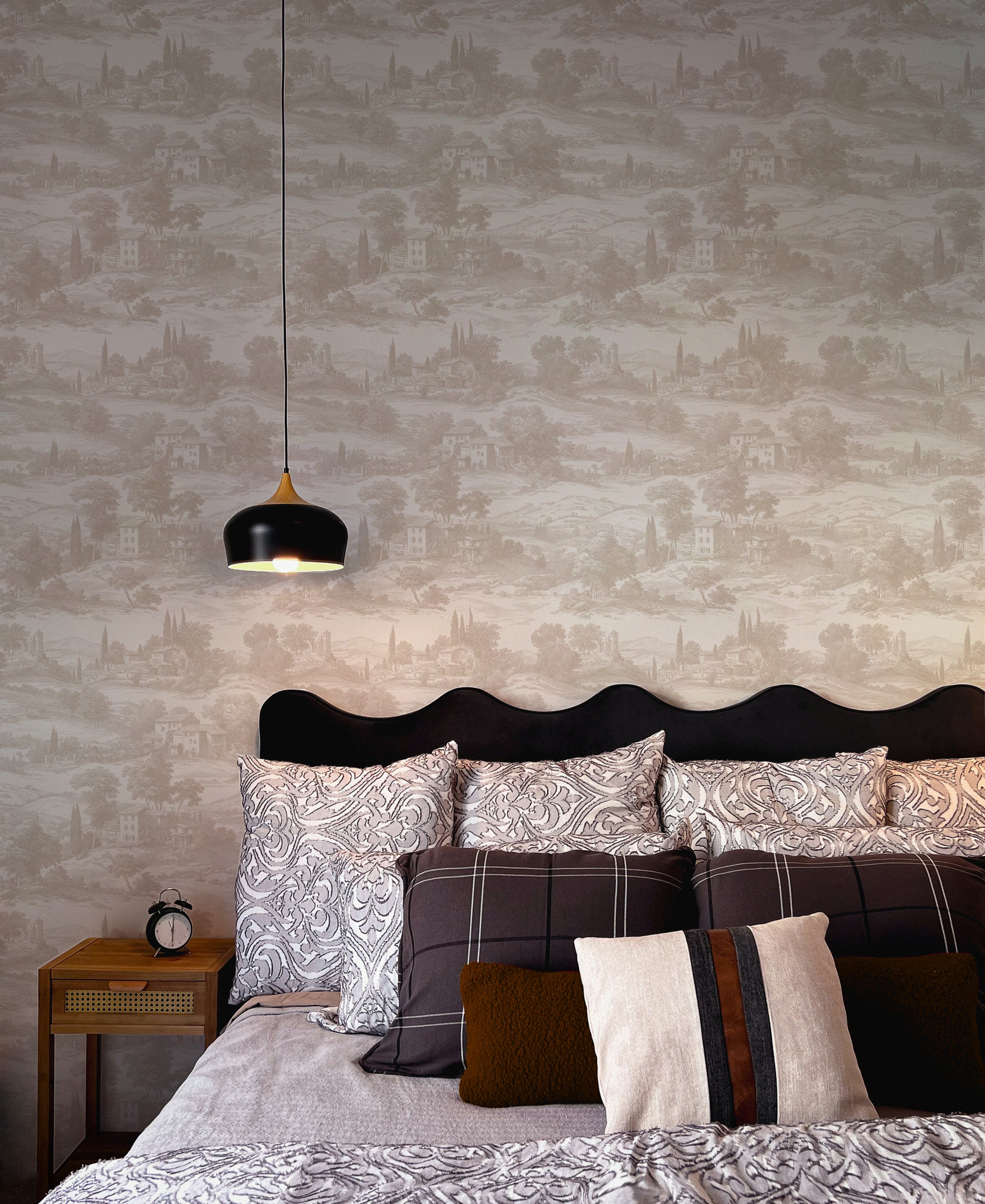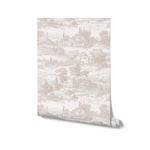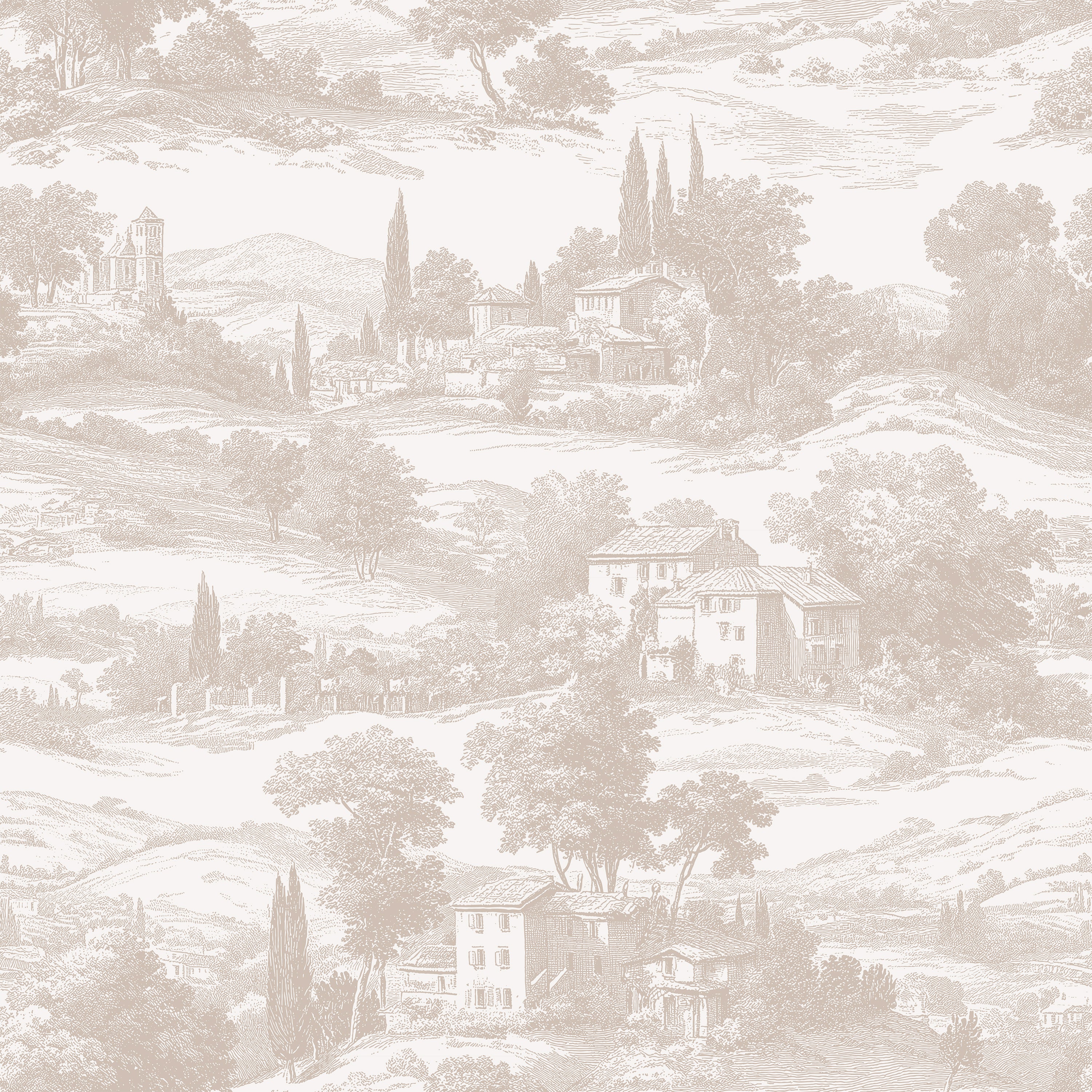 Our Villa Countryside Wallpaper features an intricate toile landscape of villas, winding paths, and cypress trees — evoking the warmth and calm of European country living. The neutral palette and fine linework make it an effortless addition to both traditional and contemporary homes, offering texture and storytelling without overwhelming the space.