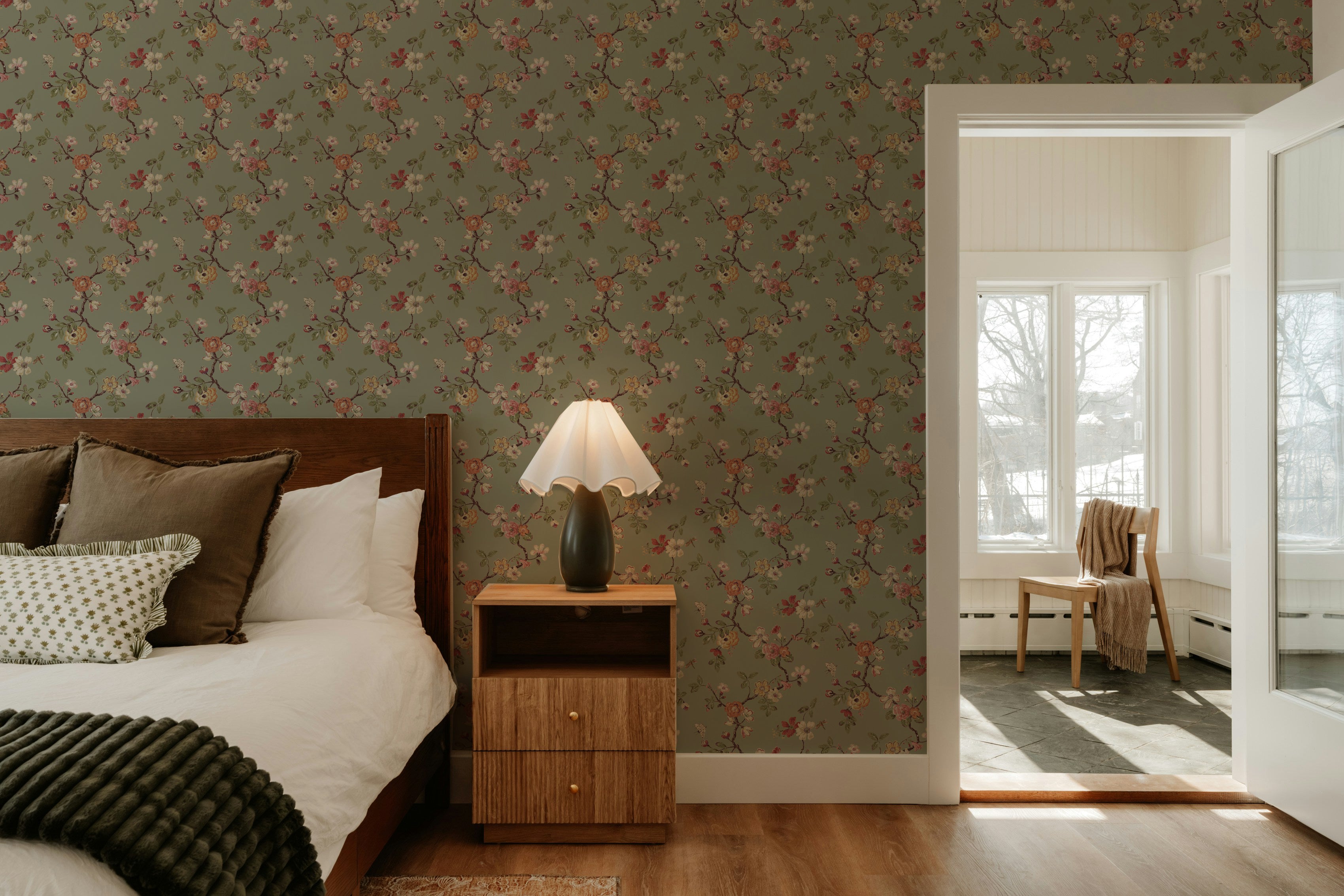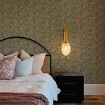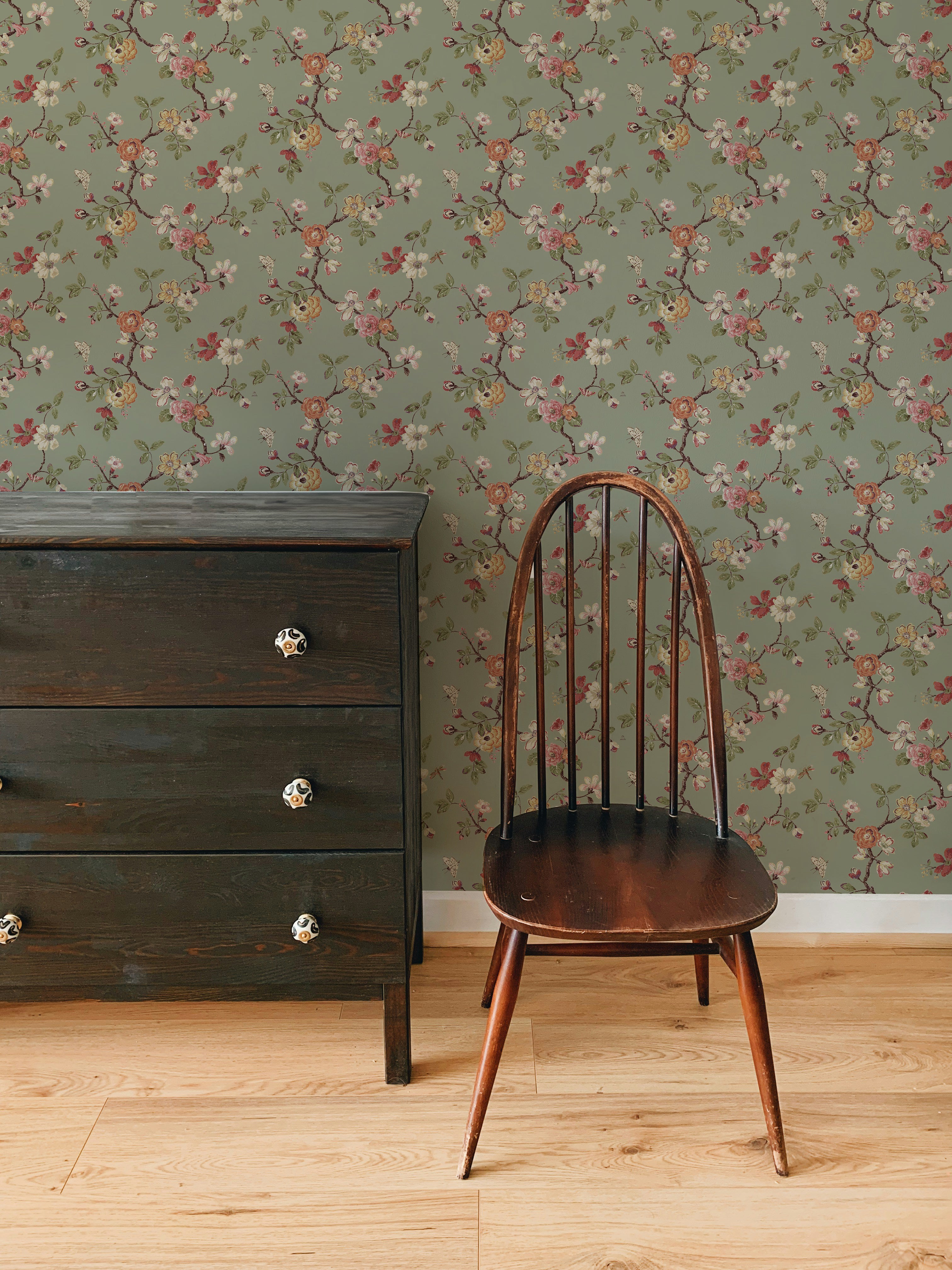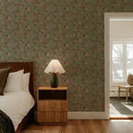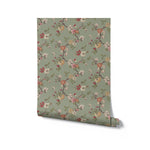 Our Drifted Florals Wallpaper features a soft scattering of winding branches and delicate blooms, set against a muted green ground. The pattern feels gently undone, like florals caught mid-movement, bringing a natural, collected look to your space.