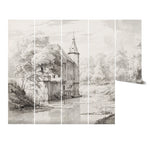 Step into a world of historic elegance with the "Kasteel Soelen - Wall Mural Wallpaper." This captivating wall covering features a monochromatic depiction of the majestic Kasteel Soelen, surrounded by lush, detailed landscapes that evoke a serene, timeless ambiance. Perfect for those looking to add a statement piece that combines artistic beauty with a touch of historical allure, this mural is ideal for both modern and traditional interiors. Its detailed greyscale palette enhances any room, offering a sophisticated backdrop that complements a wide range of decor styles. Easy to apply and maintain, it transforms your space into a noble estate with just a few rolls.