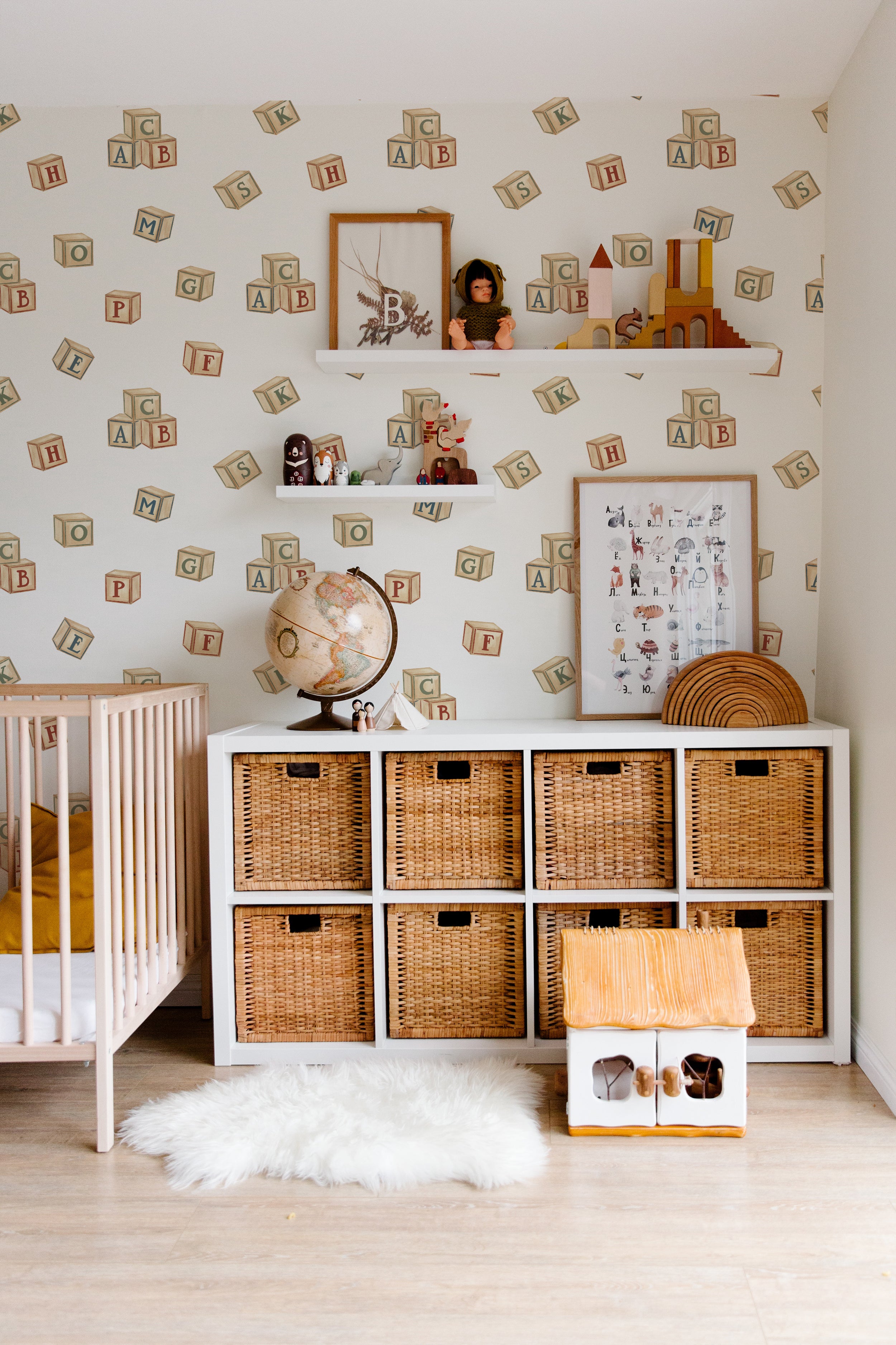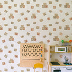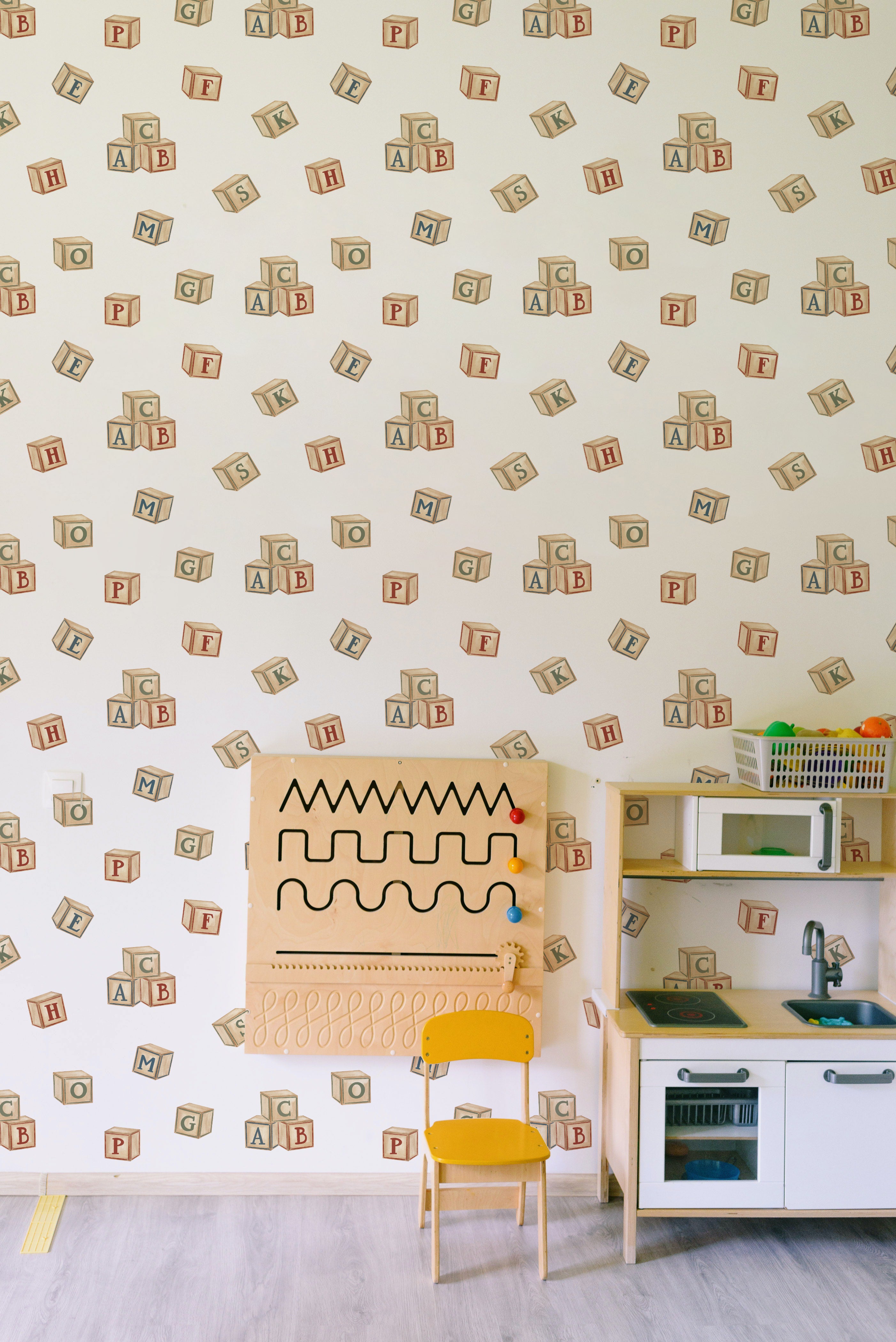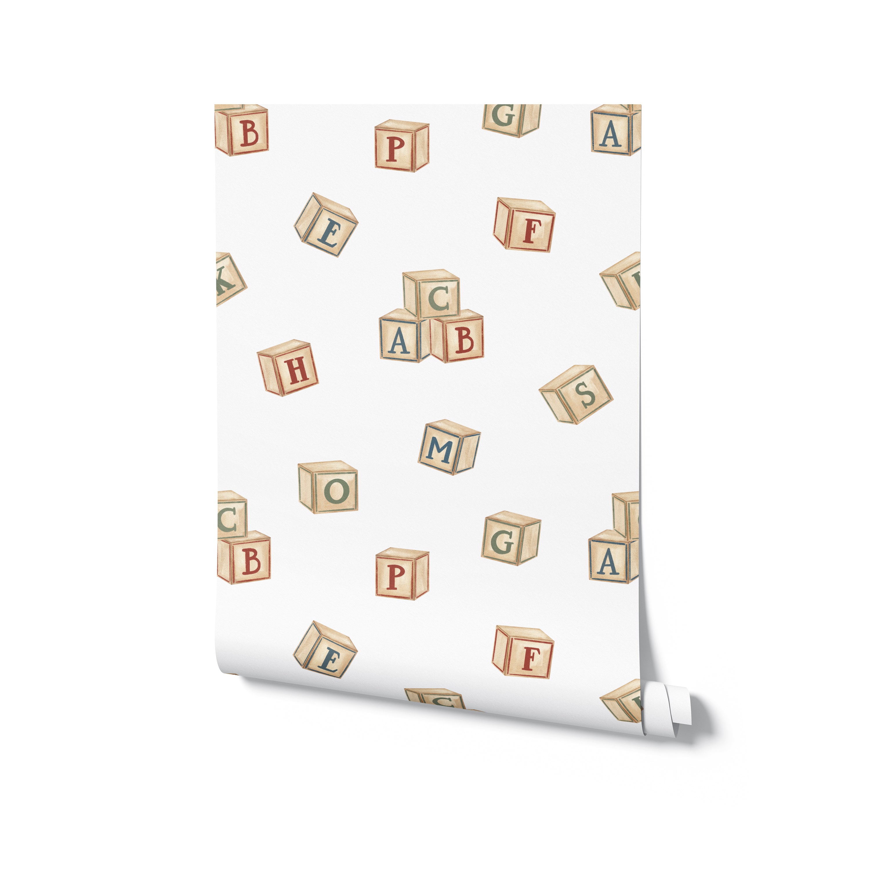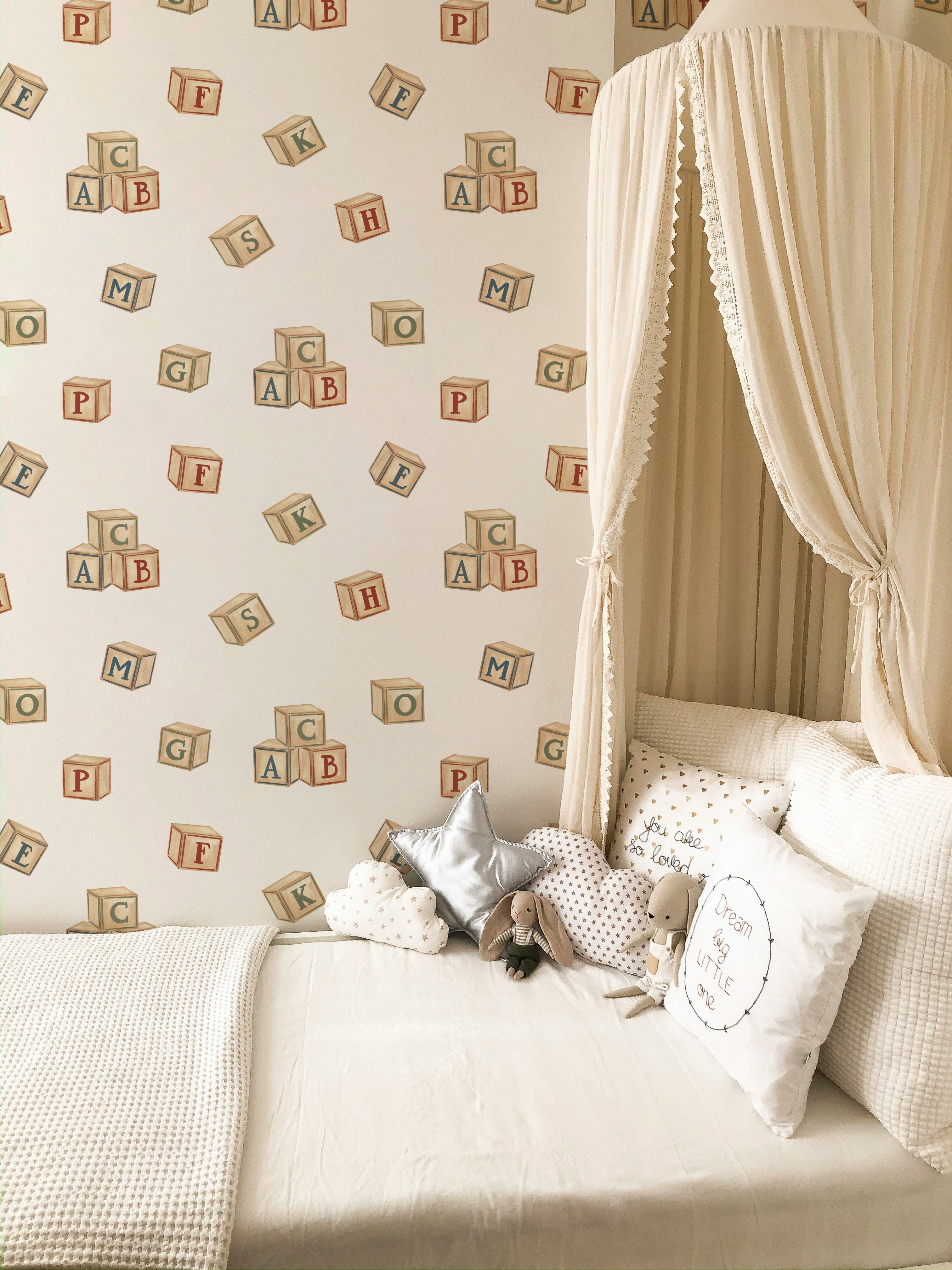 Each block features hand-drawn lettering inspired by classic toy designs, creating a space that feels imaginative, cozy, and full of storybook charm. Printed to order in Canada, this design is available in both traditional unpasted and textured peel and stick wallpaper options for easy installation.