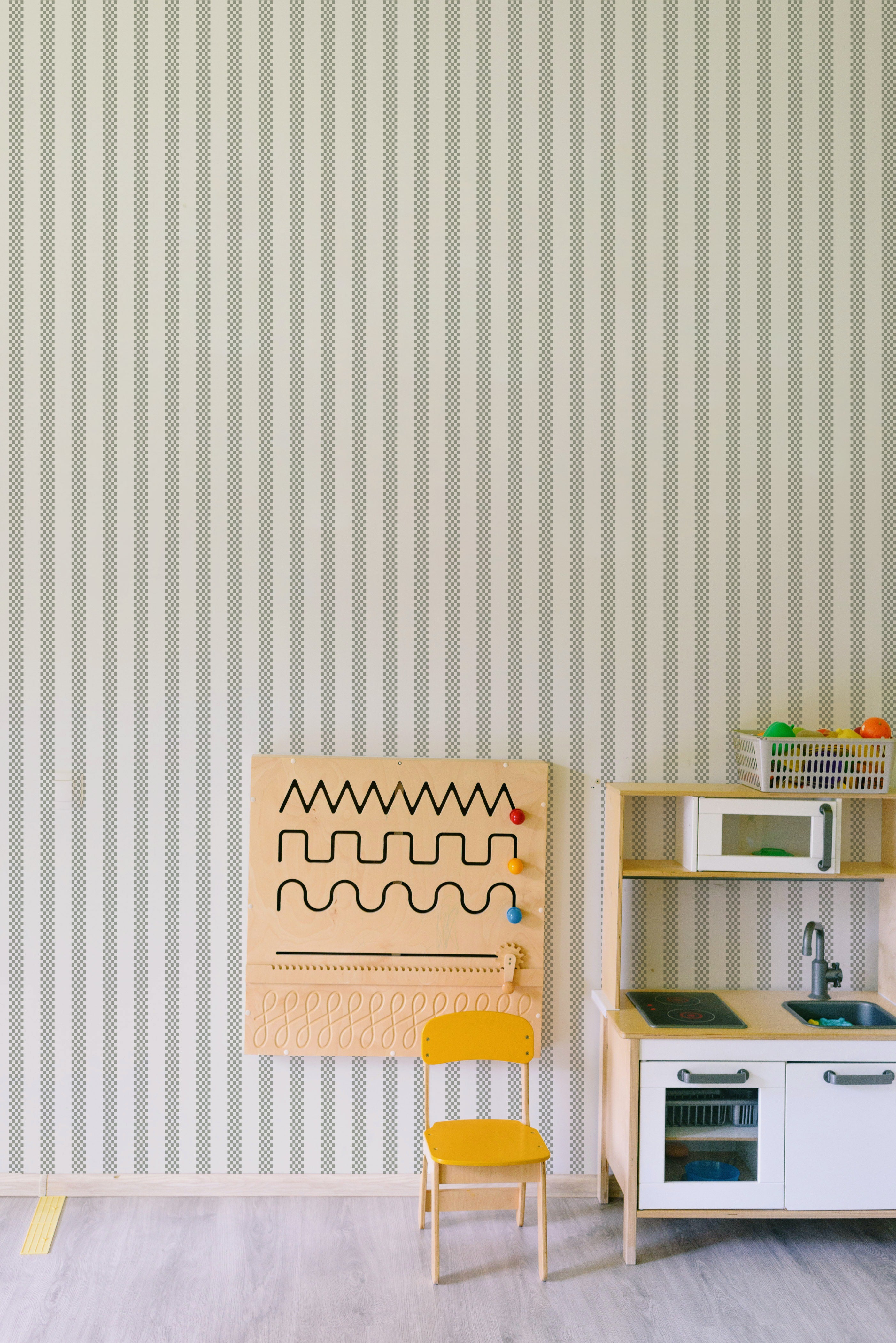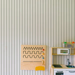The vertical design helps visually elongate walls, making it a great choice for nurseries, kids’ rooms, bedrooms, and shared living spaces. Designed to grow with your space, this pattern wallpaper feels just as fitting for a baby’s room as it does for an older teen. The colours pair easily with wood furniture, soft textiles, and vintage-inspired décor, allowing the wallpaper to work seamlessly as the room evolves, and can be customized to suit your preferred colour palette.