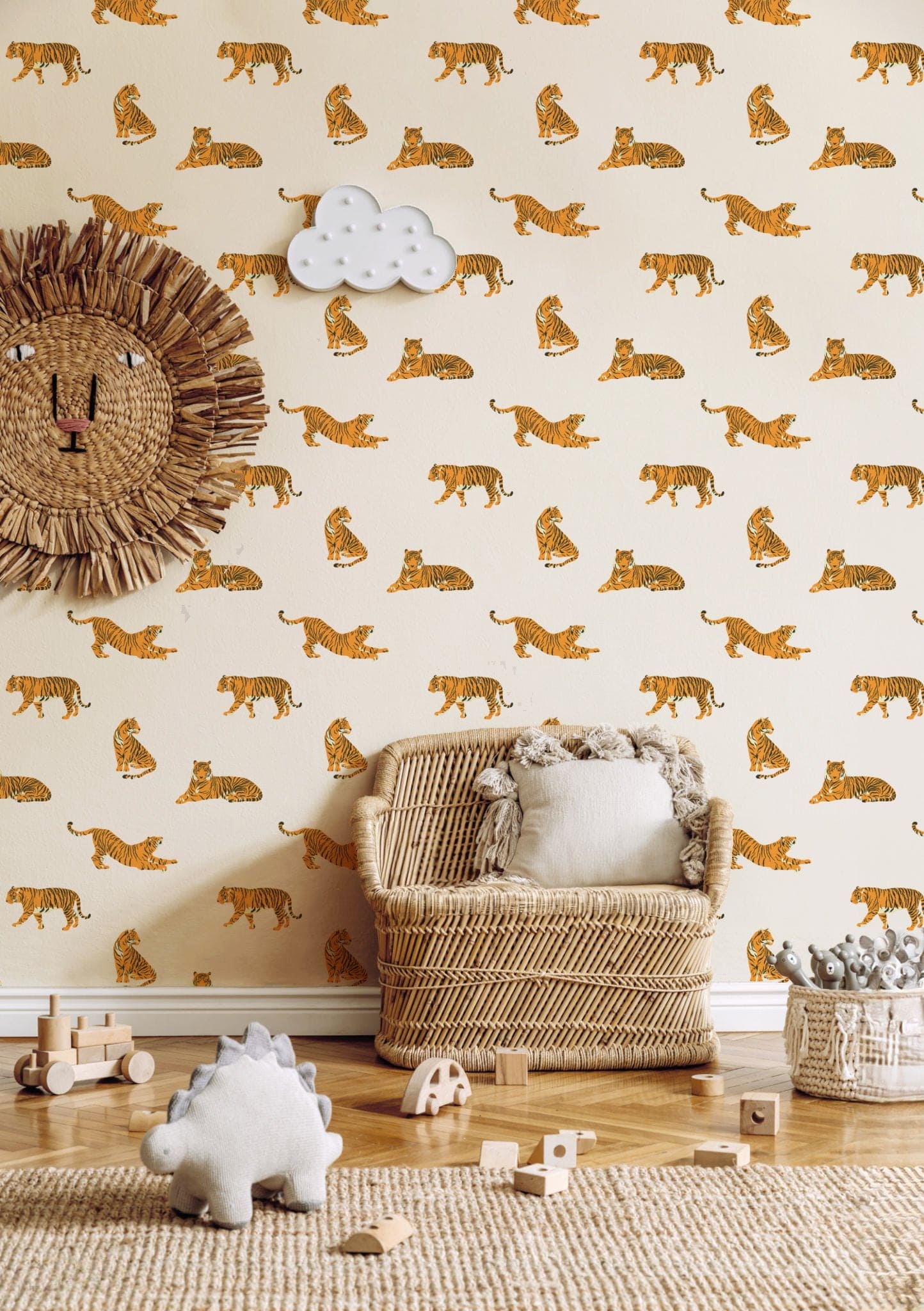 Bring the wild indoors with our Tiger Wallpaper, a bold and captivating design that showcases majestic tigers in relaxed and graceful poses. Perfect for adding a sense of adventure and sophistication to any room, this wallpaper features a clean, minimalist background that highlights the vibrant orange and black stripes of the tigers. Whether in a kids' bedroom, a study, or a statement wall, this design brings a touch of the jungle to your space. Easy to install and crafted with high-quality materials, it's both durable and effortlessly stylish.