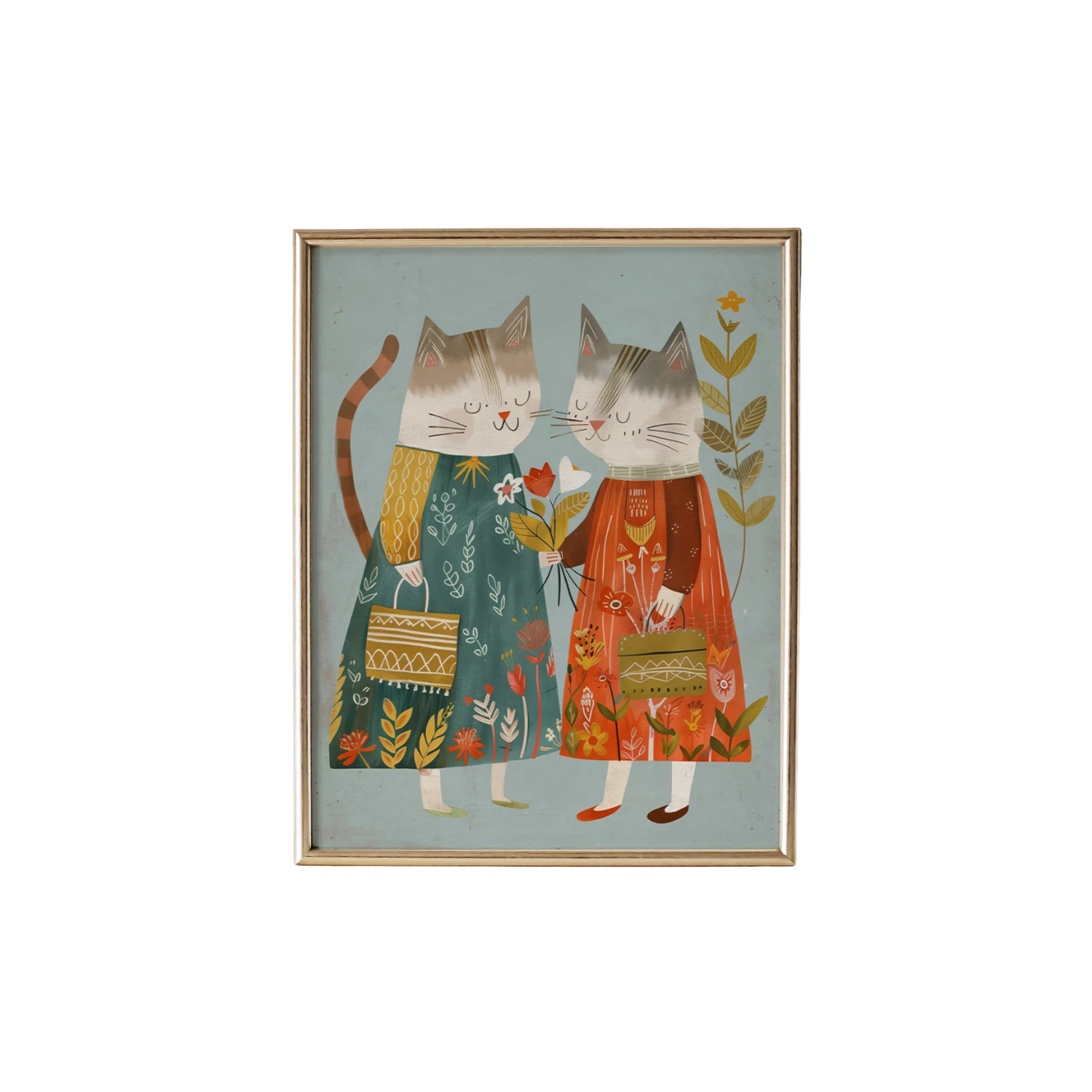 Add a touch of charm and whimsy to your child's room with our "Whimsical Cats" art print. This delightful artwork features two adorable cats dressed in beautifully detailed floral-themed dresses, holding vibrant flowers. The playful design and rich colors make this print a perfect addition to any nursery, playroom, or kids' bedroom. Printed on high-quality paper, this art print is available in various sizes and frames to suit your decor needs. Bring joy and a touch of fantasy to your home with this enchanting piece from the Timberlea Interiors Kids Art Print Collection.