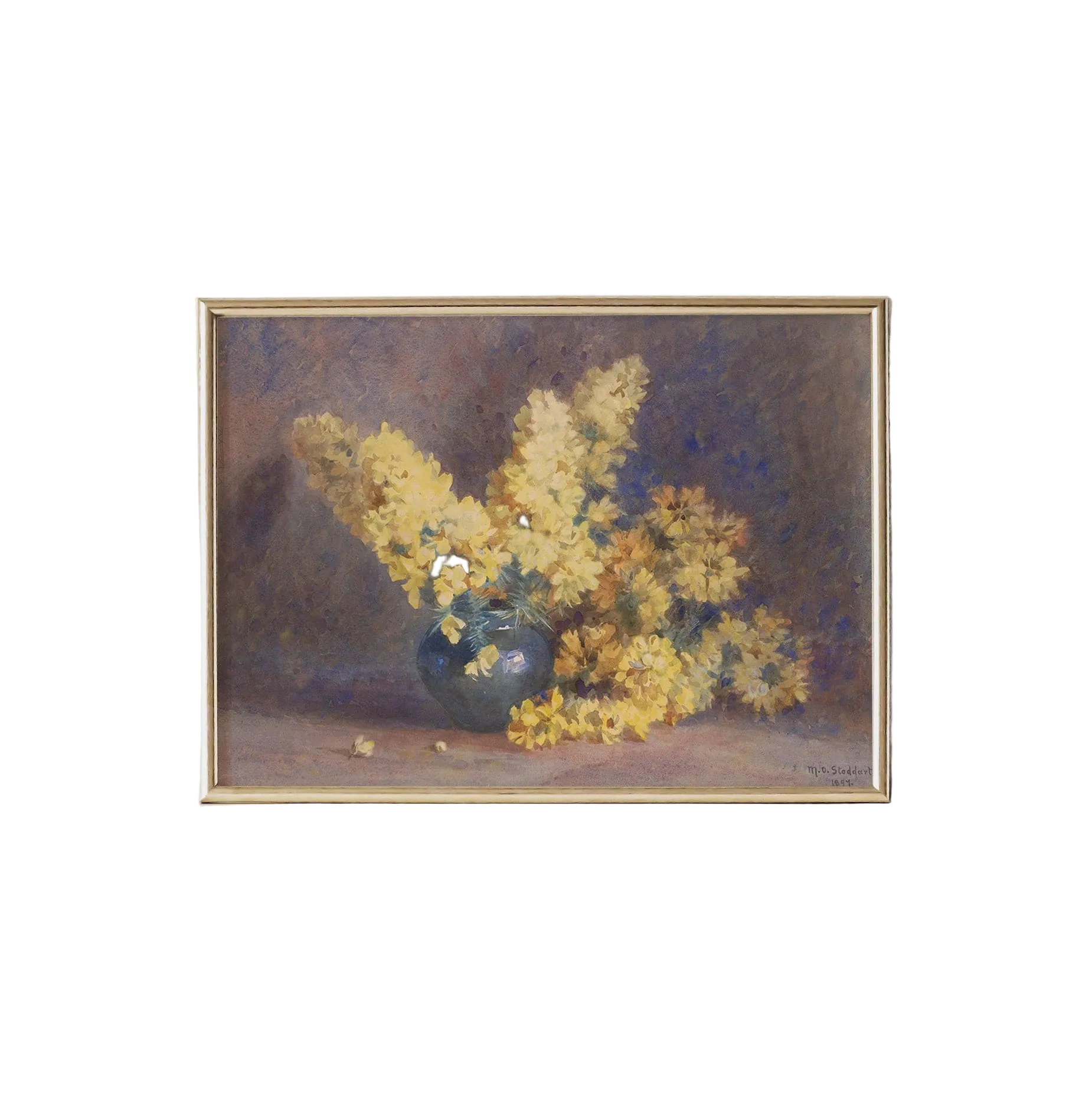 Bring the serene beauty of nature into your home with the "Yellow Blossom and Rosemary" (1897) vintage art print by renowned New Zealander artist Margaret Stoddart. This exquisite piece features a vibrant arrangement of yellow blossoms in a charming blue vase, set against a softly textured background. Stoddart's delicate brushwork and subtle use of color create a tranquil and captivating scene that enhances any interior space.